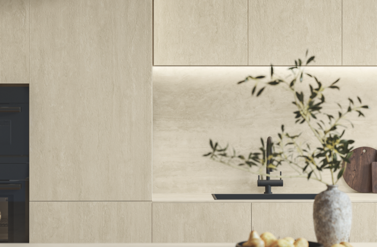 La nuova lastra in gres porcellanato effetto marmo bianco Travertino Navona White di Atlas Plan è uno strumento progettuale versatile e ideale per cucine raffinate e luminose