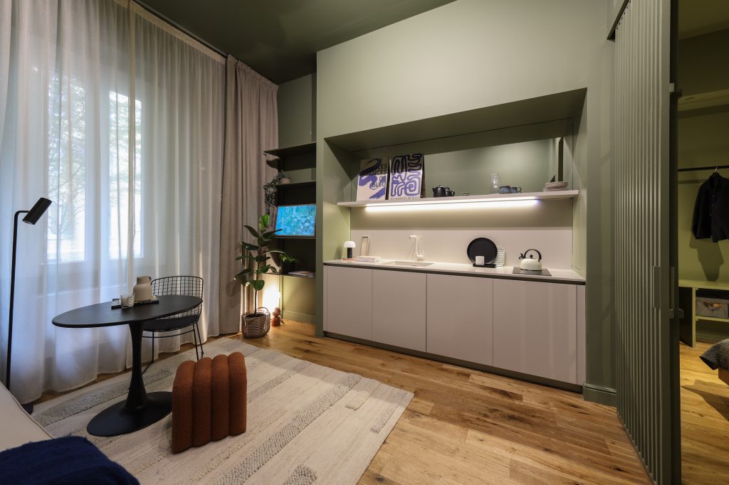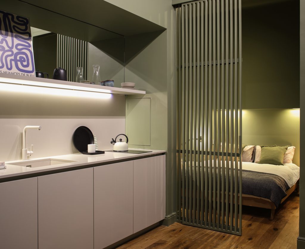 A sliding wooden slatted door, painted in the same green tone as the walls, separates the living area from the bedroom without disrupting visual continuity or natural light. This solution allows the space to remain fluid and interconnected, reinforcing the perception of openness while maintaining functional separation.