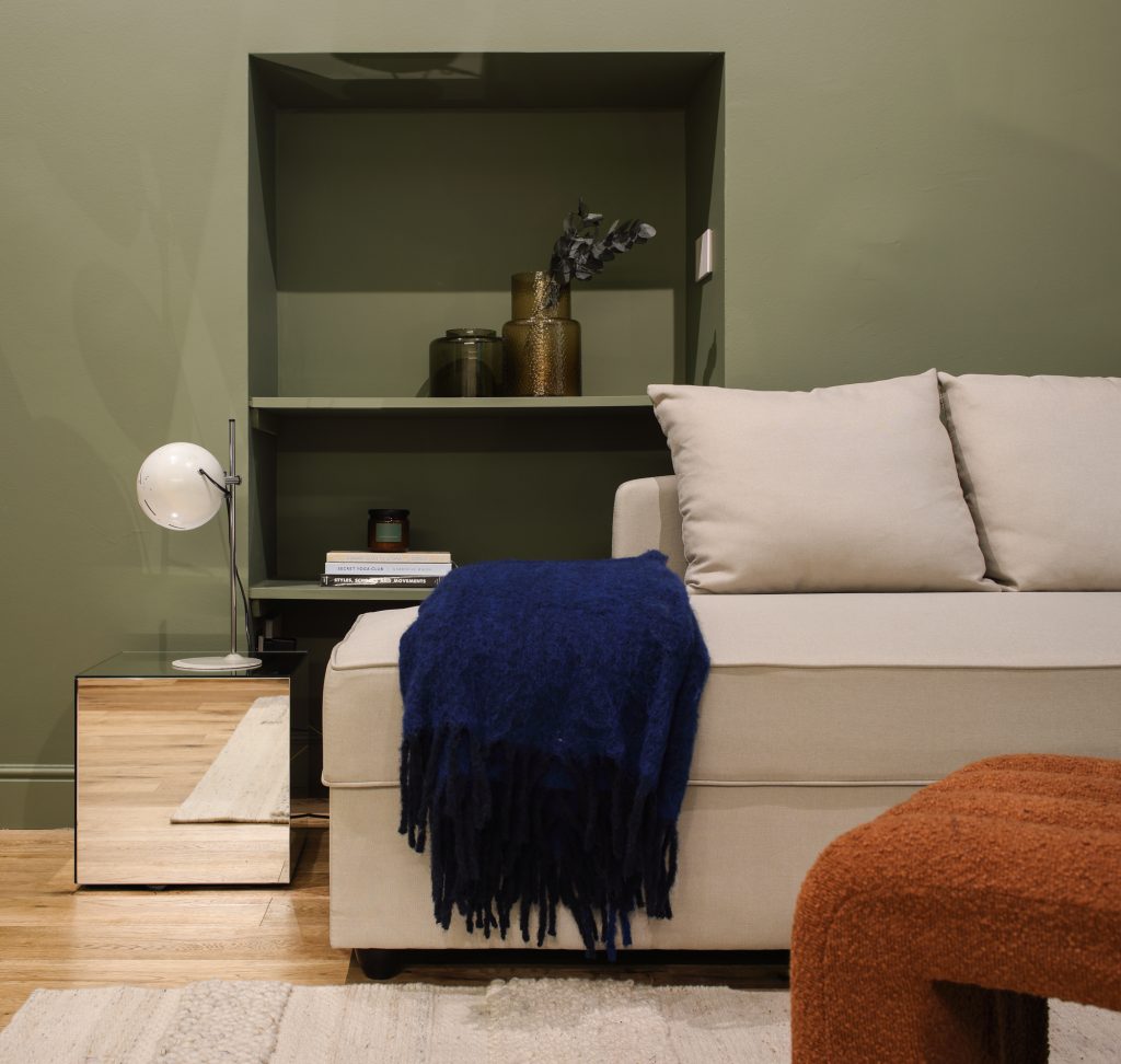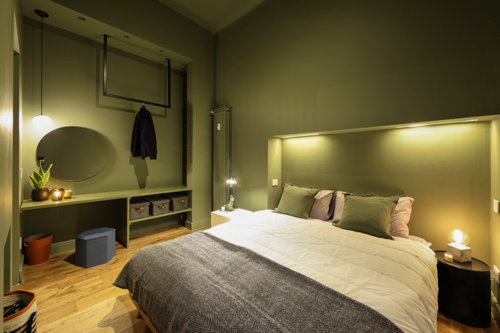 Colour plays a central role in shaping the apartment’s identity. Moving away from an initially neutral palette, the studio opted for deep green tones by Little Greene, applied uniformly across the walls. This bold choice gives the space a strong, recognizable character while enveloping it in a soft and sophisticated atmosphere, enhanced by the material quality and depth of the finish.