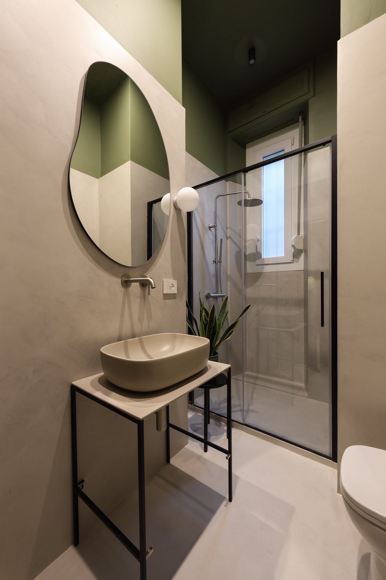 The bathroom and powder room are finished in microcement, chosen for its durability, aesthetic continuity, and contemporary appeal. Finishes and material selections throughout the apartment were carefully calibrated to meet the standards of high-quality hospitality, combining practicality with refined design.
