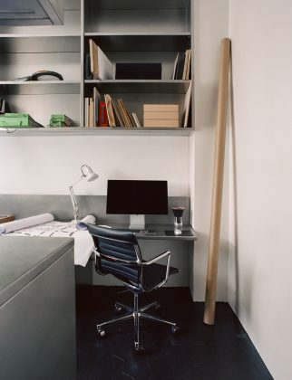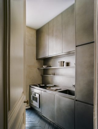 The Atelier line customises the kitchen of the 100 m2 studio/pied-à-terre in Saint-Germain-des-Prés, a Parisian 'arrondissement' packed with antique dealers and art galleries, with a wall configuration orbitally polished by hand. Martin Brûlé chose tall unit and wall unit storage modules with squared, hinged doors, and shelves of various depths openly to display everyday utensils. The backsplash of the worktop entirely covers the wall behind it, in perfect aesthetic continuity, while the double sink is integrated into the joint-free top. The black treated herringbone parquet flooring and the ivory texture on the wall complete the setting, which the same designer created by joining the two rooms that envelop the stainless steel kitchen.