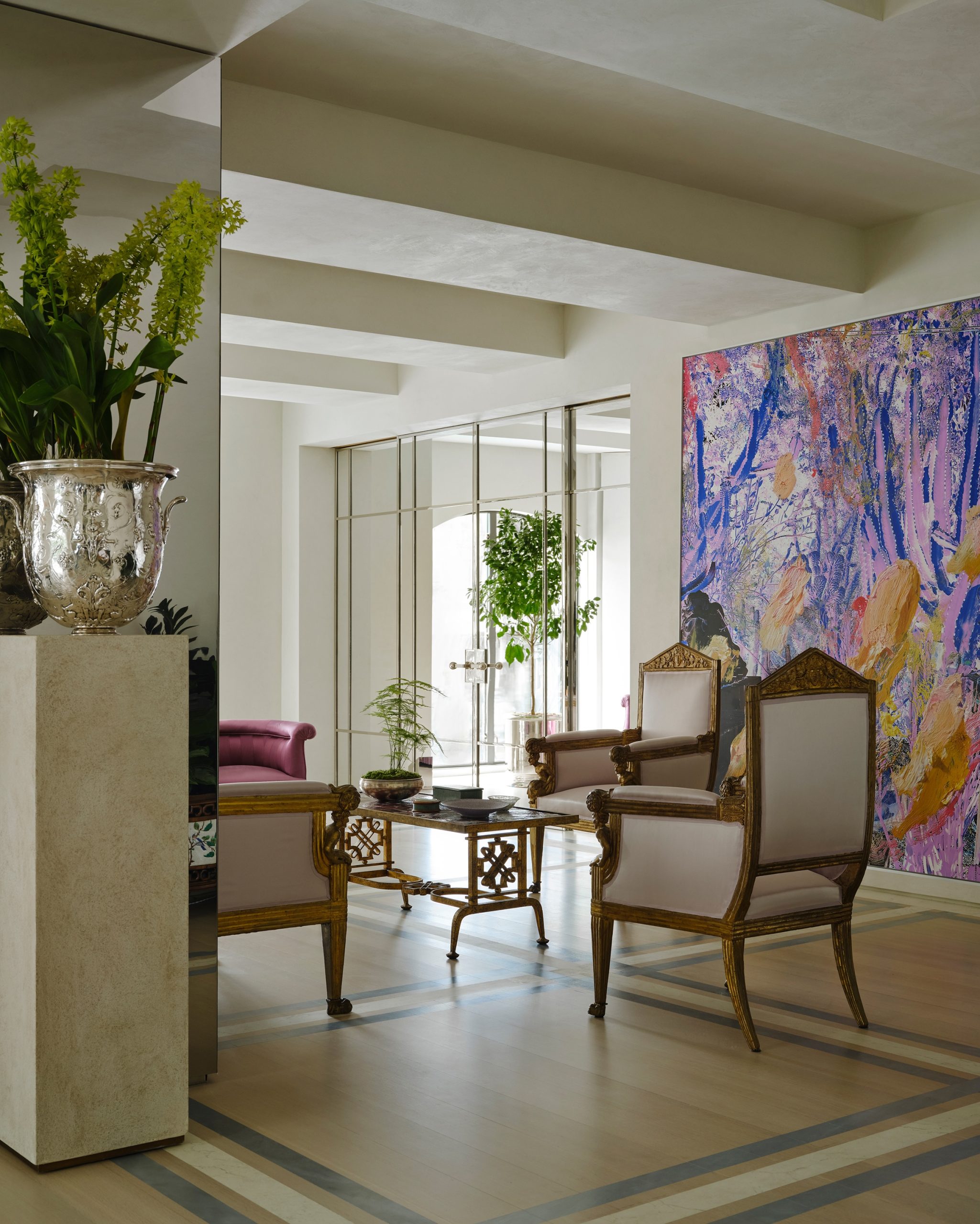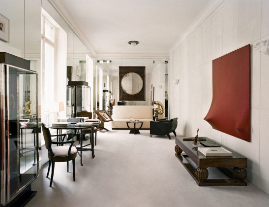 The second wall block features induction hobs, a customised professional hood, a sink and shelves, all applied on a mirror-finish stainless steel cladding. The fixed knob handles, in the same finish as the two blocks, were designed by Martin Brûlé and also characterise the island, which incorporates a wine cellar. Here, the worktop is joint-free and features a raised non-drip edge, ideal for preparing and plating dishes to be served in the adjoining dining room on the south side of the loft, along with the living area, both rendered unique by precious antique and modern pieces, and a vibrant combination of velvets, silks, and satins in bright colours.