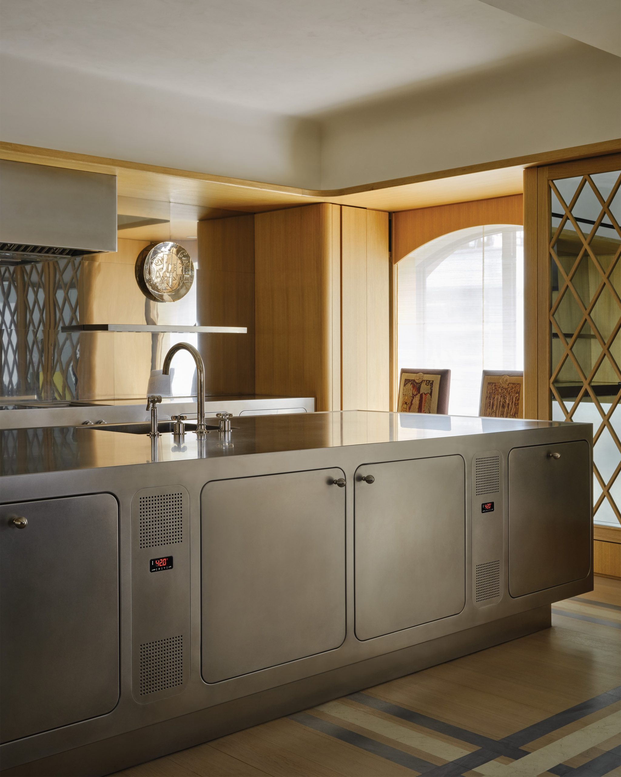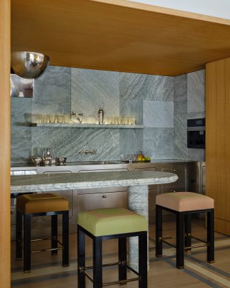 The Ego line, designed by Alberto Torsello, instead plays the starring role in the 1,000 m2 loft overlooking Central Park and 5th Avenue, in the heart of Manhattan. Here, the kitchen orbitally polished by hand unfolds between two wall elements and a significantly sized island. The first configuration is dedicated to cooking and is set into a wall made entirely of turquoise mottled marble, with varying shades and sizes of slabs – rectangular or square. Here, the built-in ovens, double sink, and other cooking elements combine with compartments featuring rounded flush doors and drawers, with high-capacity pull-out internal shelves for storing dishes and utensils.