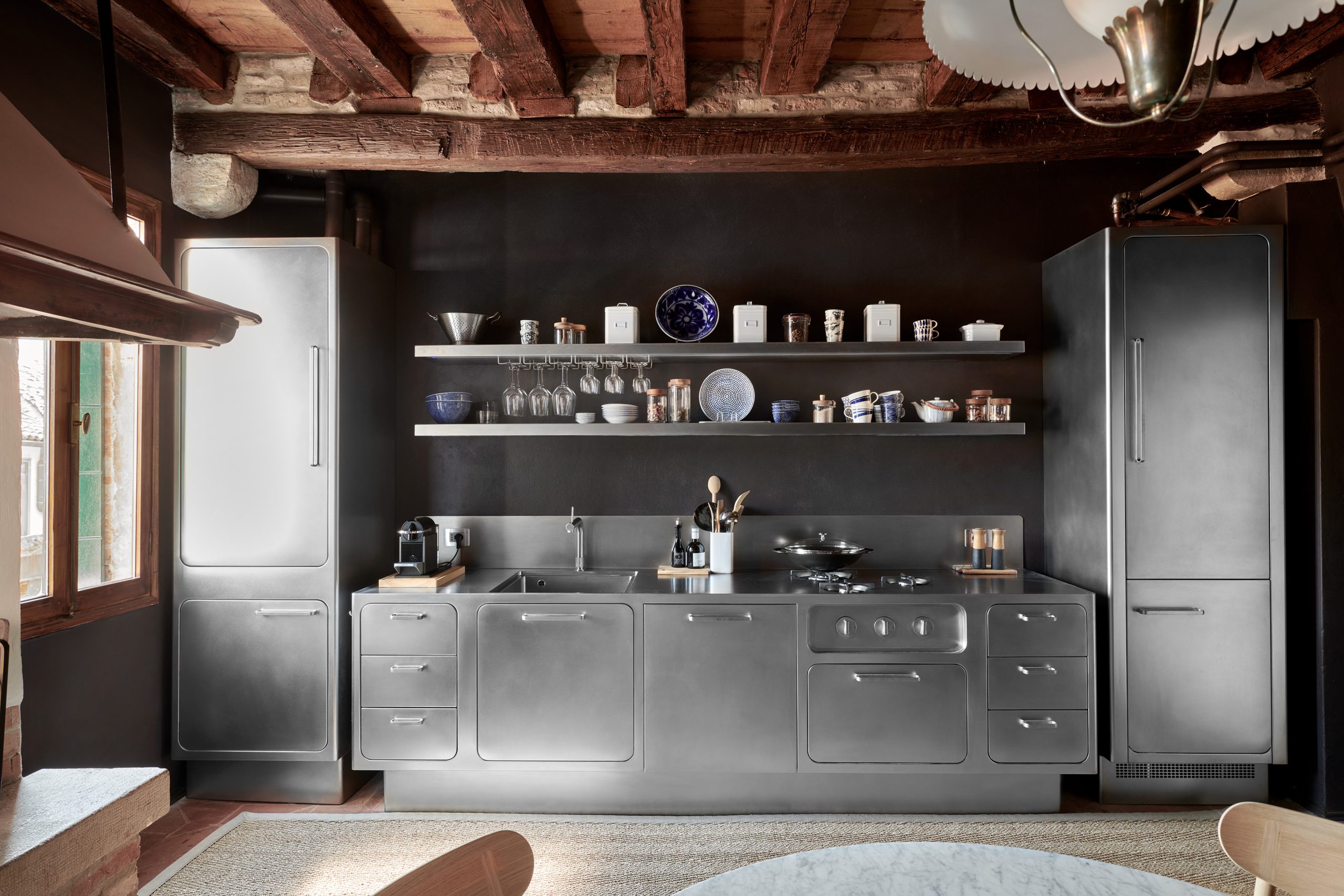 Il progetto dell'arredo cucina pensato per questa abitazione a Venezia è costituito da un blocco operativo dedicato a cottura e lavaggio affiancato da due colonne: una attrezzata a frigorifero, l’altra destinata a dispensa. Una configurazione compatta e completa, pensata per assicurare la massima ergonomia e un’organizzazione ideale delle funzioni. Al di sopra del blocco, due mensole in acciaio integrano un sistema porta-bicchieri, aggiungendo una componente funzionale e ‘grafica’ alla composizione.