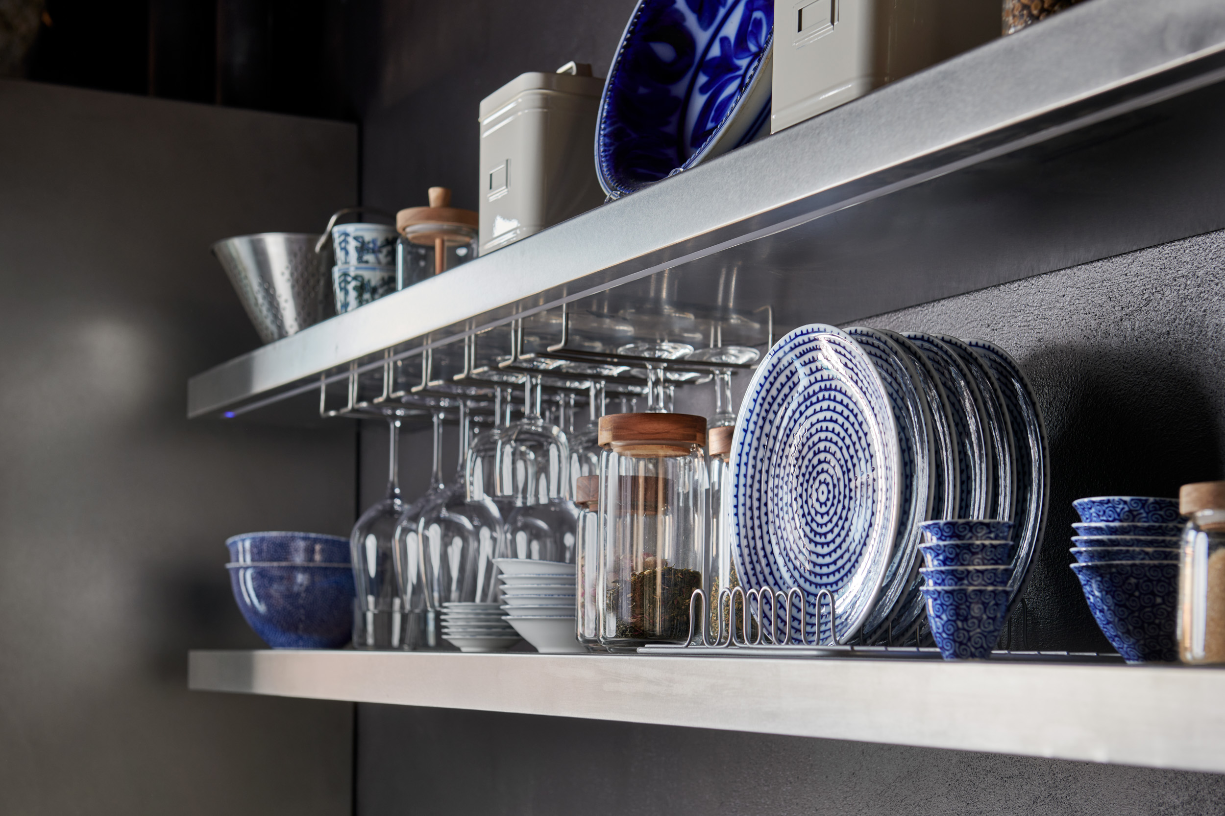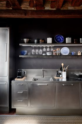 Il progetto dell'arredo cucina pensato per questa abitazione a Venezia è costituito da un blocco operativo dedicato a cottura e lavaggio affiancato da due colonne: una attrezzata a frigorifero, l’altra destinata a dispensa. Una configurazione compatta e completa, pensata per assicurare la massima ergonomia e un’organizzazione ideale delle funzioni. Al di sopra del blocco, due mensole in acciaio integrano un sistema porta-bicchieri, aggiungendo una componente funzionale e ‘grafica’ alla composizione.