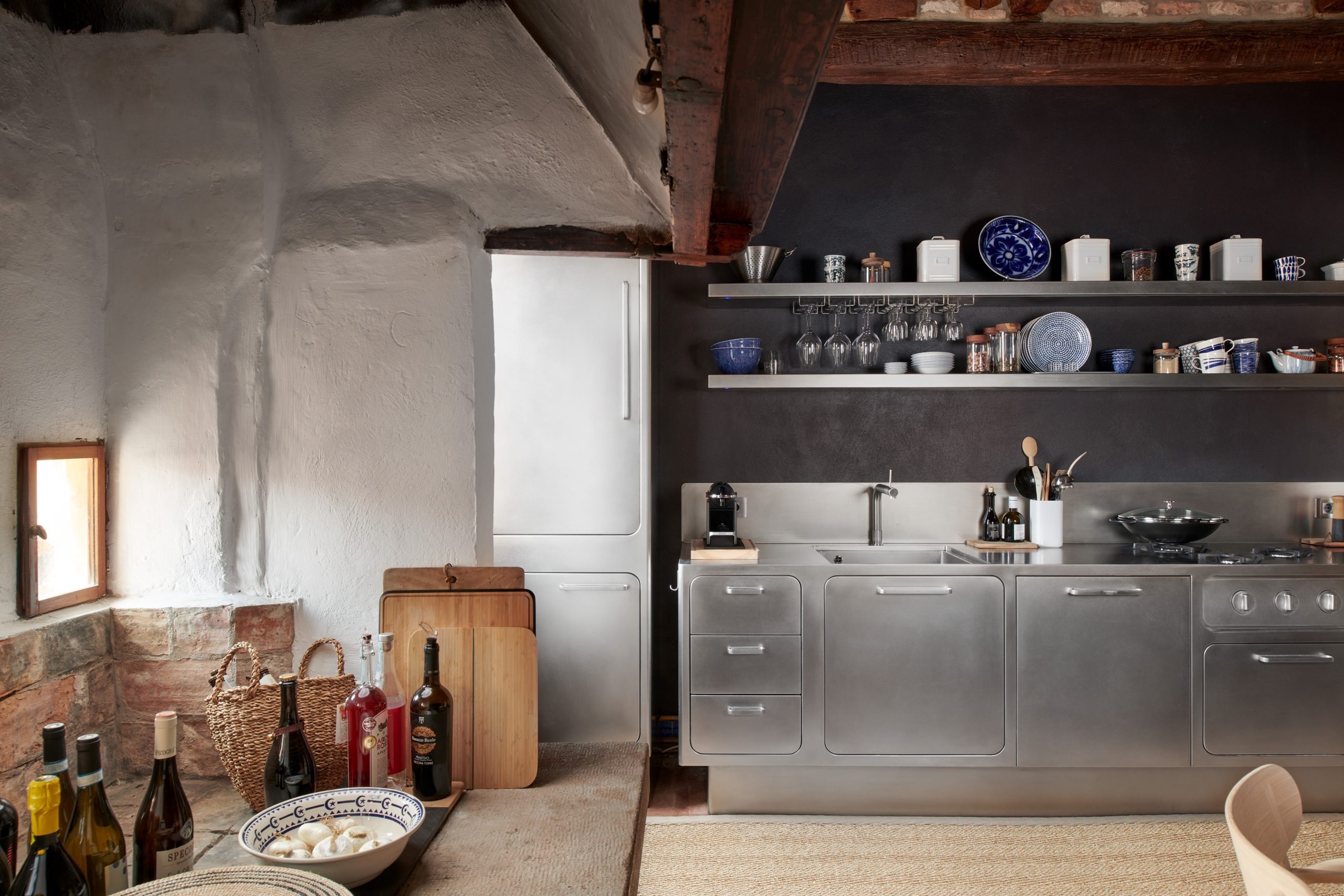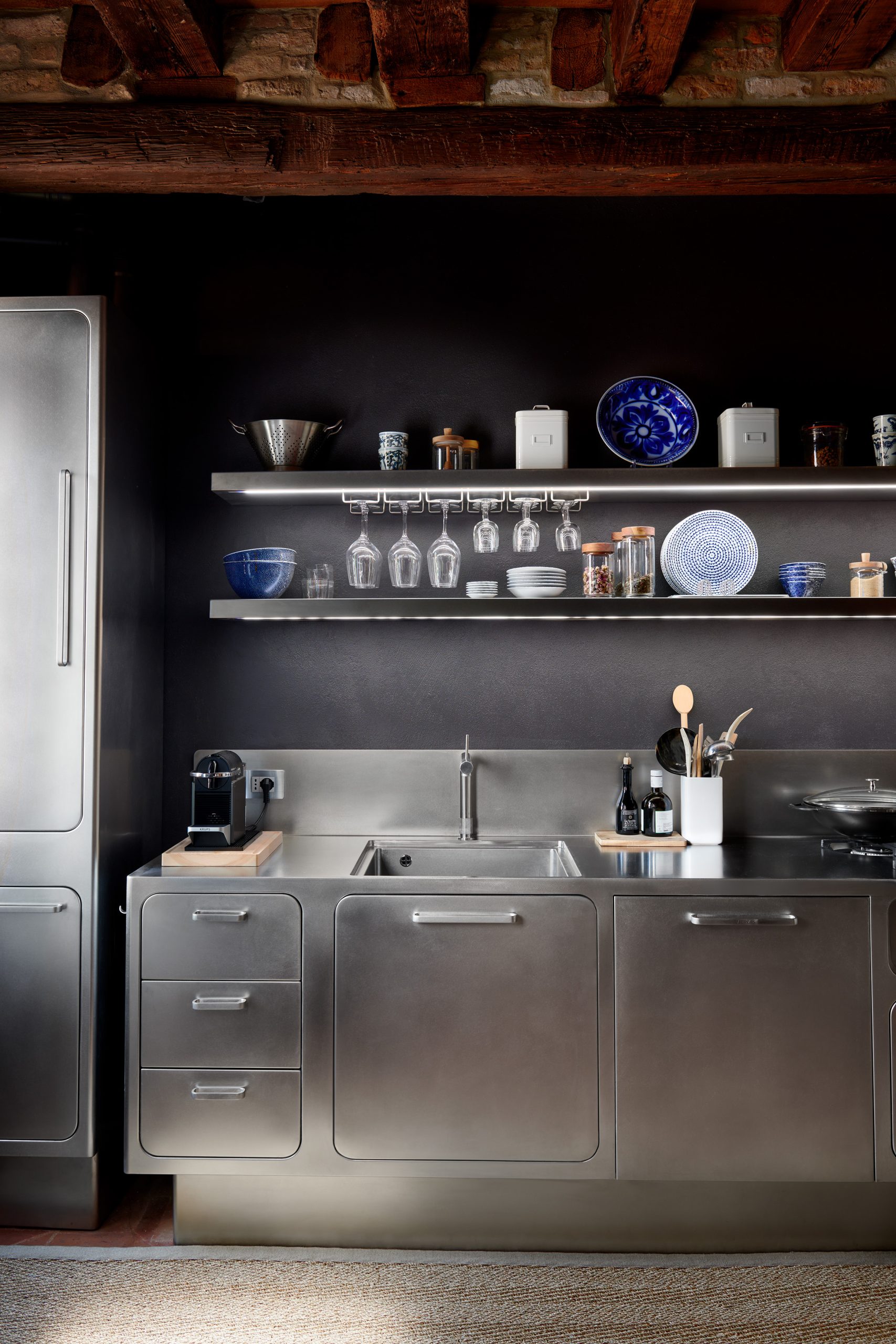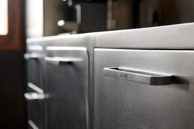 La proprietaria, appassionata di cucina tradizionale italiana, ha scelto una configurazione creata custom con il modello Ego di Abimis, cI frontali e il piani della cucina sono finiti in acciaio orbitato, trattamento artigianale che addolcisce la percezione visiva e tattile conferendo calore e matericità alla cucina. Il risultato è un ambiente accogliente, equilibrato, piacevole da vivere.