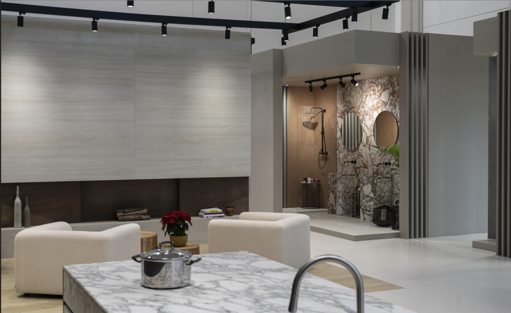 Lo showroom di 200 mq è stato progettato dallo studio Archidesign, in collaborazione con l'ufficio stile ABK Group. L'esposizione dedicata ad ABKStone e Materia valorizza estetica e funzionalità delle lastre ceramiche arricchite da tecnologie uniche come FullVein3D che permette di ricreare le venature tipiche del marmo, in perfetta continuità tra superficie e spessore della lastra o come Cooking Surface Prime, il piano cottura a induzione invisibile integrato sotto le superfici ABK Group, che dona al countertop un effetto estetico particolarmente interessante per il mondo dell'arredo cucina e consente di coordinarlo facilmente con pavimenti e pareti.