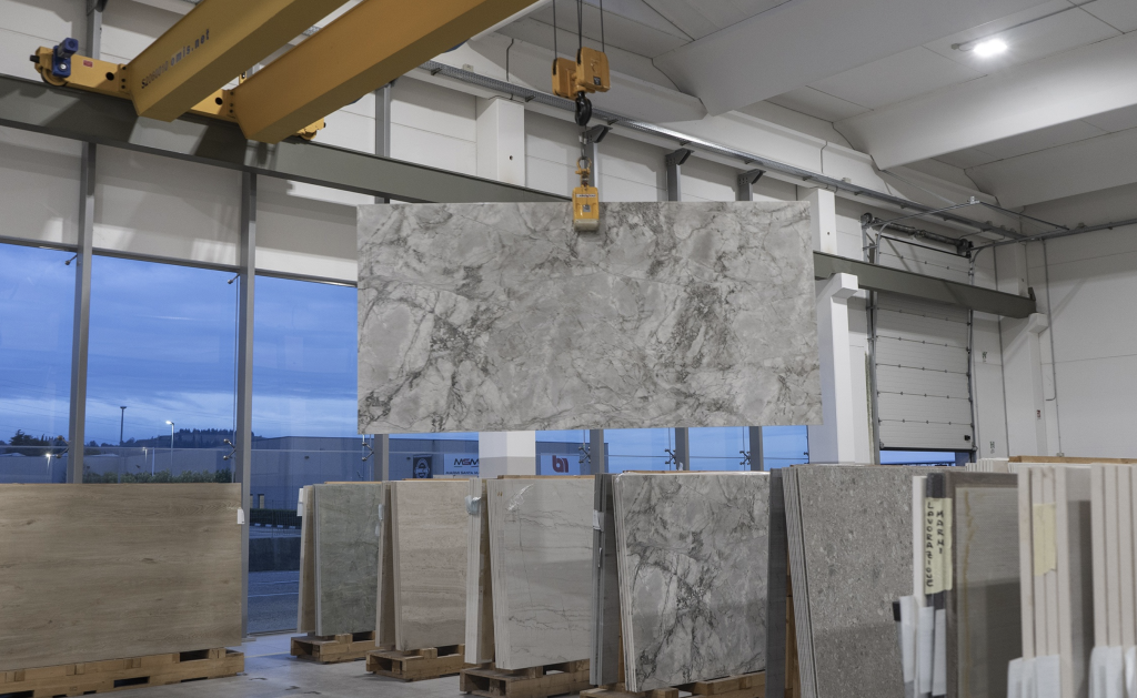 All'esposizione, caratterizzata da realizzazioni e ambientazioni finite che sottolineano il lato emozionale dell'interior design su misura, si affianca un magazzino coperto di quasi 600 mq dove le lastre, protette dagli agenti esterni, possono essere visionate e scelte dai visitatori. La logistica è uno dei fattori che maggiormente hanno portato alla creazione di ABK Group Studio Affi. La convivenza con i produttori di marmo della zona agevola il trasporto delle lastre ceramiche di grande e grandissimo formato, sfruttando il transito costante di trasportatori specializzati nella movimentazione di questi prodotti.