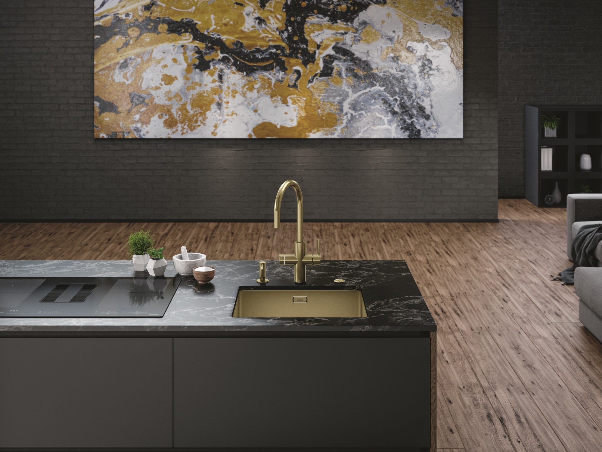 Franke con la sua ultima generazione di miscelatori per acqua filtrata e soluzioni integrate per il trattamento dell’acqua, permette di avere acqua filtrata con un semplice gesto, con una scelta sostenibile e responsabile: grazie a queste soluzioni, infatti, è possibile creare un impatto positivo sull’ambiente in quanto l’acquisto di bottiglie di plastica sarà solo un lontano ricordo. Franke ha diverse proposte: Mythos Water Hub (nell'immagine, in finitura Gold) è un’innovativa soluzione domestica 6-in-1 che consente di selezionare con semplicità e ottenere istantaneamente la tipologia d’acqua desiderata: oltre alle tradizionali opzioni di acqua calda e fredda, 4 funzioni speciali di acqua filtrata: ambiente, refrigerata, frizzante, bollente istantanea. Progettato per elevare il comfort in cucina, il miscelatore 3-in-1 Maris Slim Clear Water è dotato di una leva laterale per l’acqua calda e fredda e di un innovativo pulsante ergonomico dedicato all’acqua filtrata. Altre soluzioni sono Eos & Atlas Clear Water (miscelatori a tripla via che uniscono semplicità d’uso e comfort evoluto) e Lina Clear Water 2.0, che consente di ottenere acqua filtrata pura direttamente dal miscelatore della cucina.