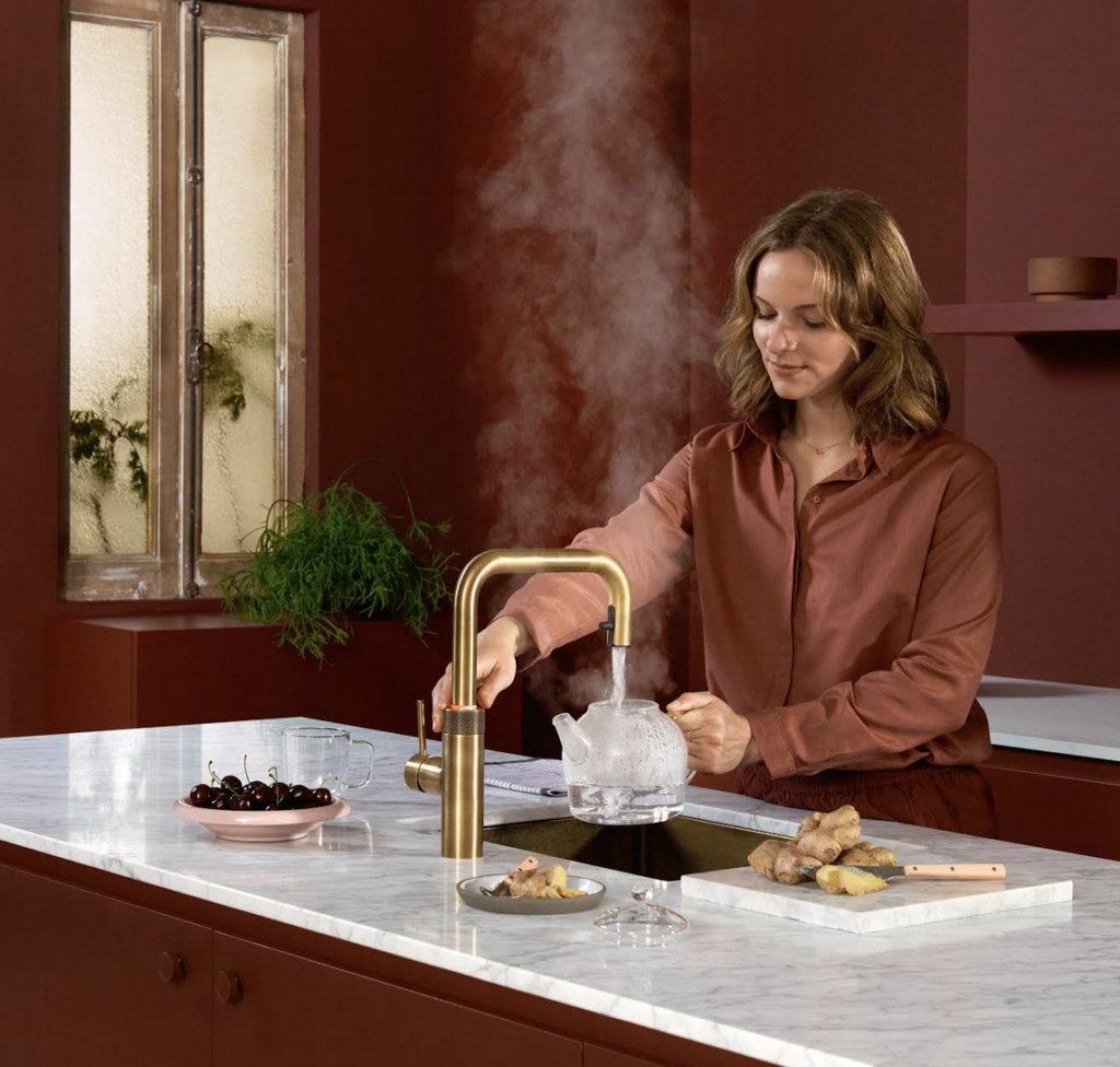 Il sistema Quooker (nell’immagine il nuovo modello Flex in ottone patinato) permette di erogare acqua bollente istantanea a 100°C, consentendo di non utilizzare altri elettrodomestici come il bollitore. E’ possibile (aggiungendo il serbatoio Cube) ottenere anche anche acqua naturale e frizzante, refrigerata e filtrata: questo consente di ridurre l’utilizzo di bottiglie di plastica, con un importante impatto positivo sull’ambiente. Quooker permette di avere sempre a disposizione l’acqua di cui si hai bisogno, nella quantità esatta che serve, evitando sprechi e migliorando l’efficienza in cucina. Con il serbatoio Combi (+) è possibile avere anche acqua calda istantanea. I cilindri di CO2 vuoti possono essere restituiti gratuitamente a Quooker che li ricarica e li prepara per un nuovo utilizzo, evitando così sprechi. L’azienda collabora con Blue Made Foundation, converte il risparmio idrico ottenuto in acqua potabile pulita nei paesi in via di sviluppo (1 litro per 1 litro).