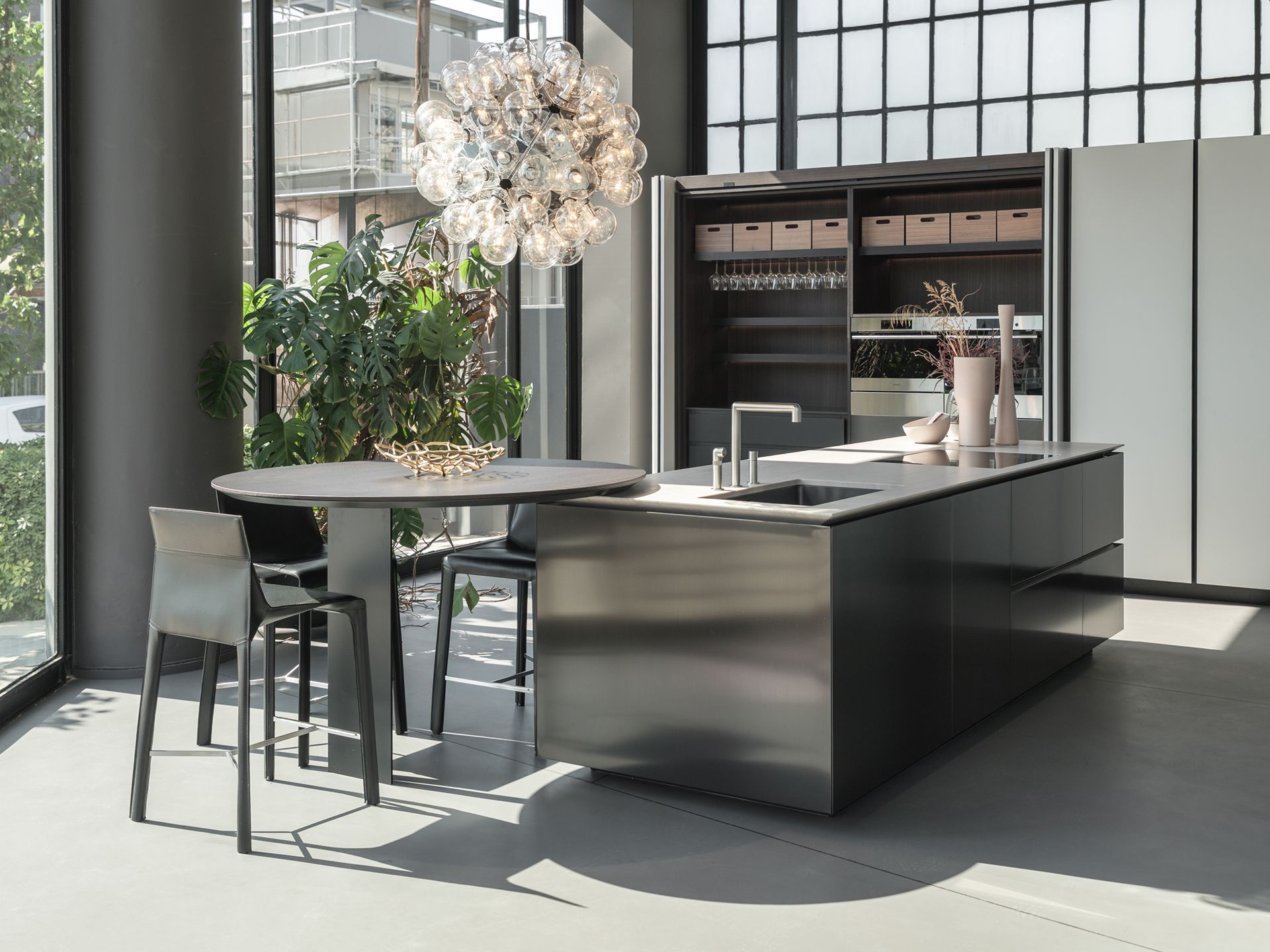 Le due composizioni cucina che spiccano delle vetrine sono veri simboli di eleganza contemporanea e precisione artigianale. Accanto ad esse, sono in mostra nuovi arrivi e pezzi iconici esposti in composizioni armoniose, che riflettono la capacità unica di Poliform di fondere materiali, texture e forme in perfetto equilibrio.