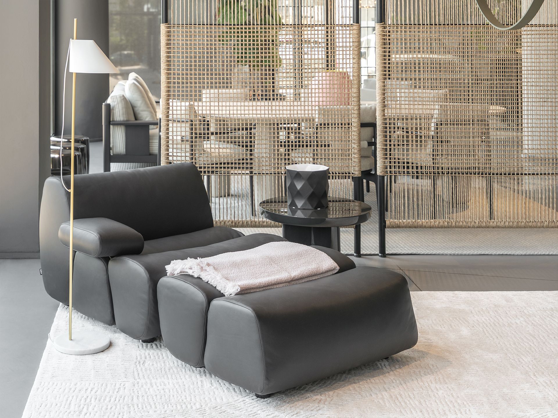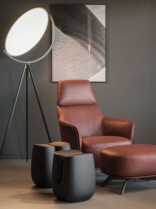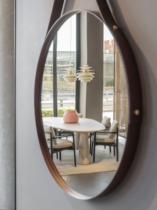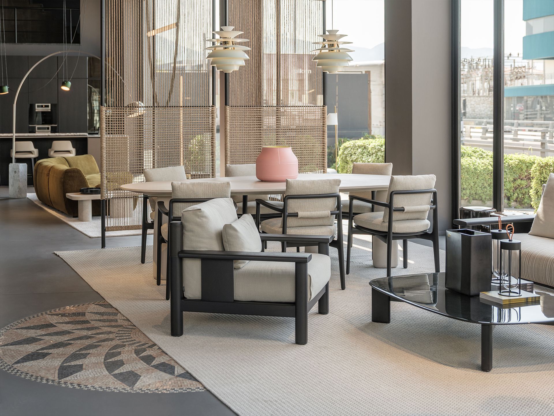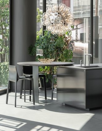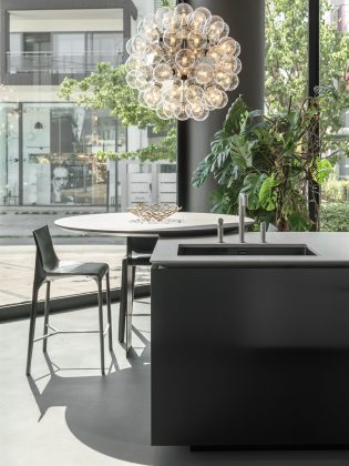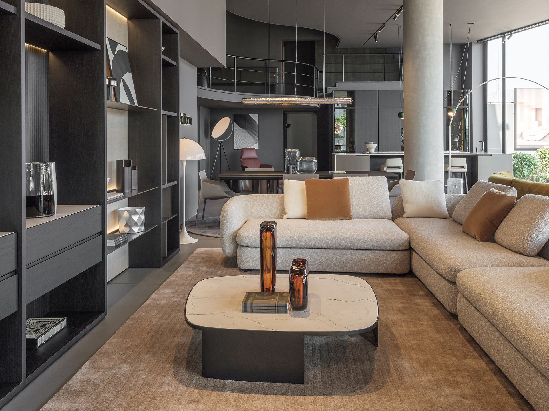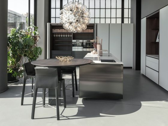 Le due composizioni cucina che spiccano delle vetrine sono veri simboli di eleganza contemporanea e precisione artigianale. Accanto ad esse, sono in mostra nuovi arrivi e pezzi iconici esposti in composizioni armoniose, che riflettono la capacità unica di Poliform di fondere materiali, texture e forme in perfetto equilibrio.