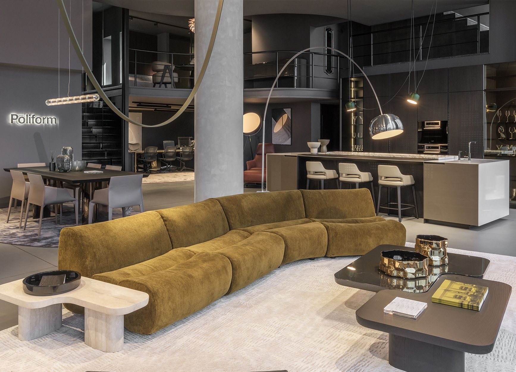 Su 320 mq di superficie espositiva totale, Poliform espone tutta la propria collezione d'arredo per la casa, dalla zona giorno alla sala da pranzo, dalla camera da letto fino alla cucina che qui viene proposta con due composizioni a isola realizzate con i modelli Alea Pro e Artex Pro.