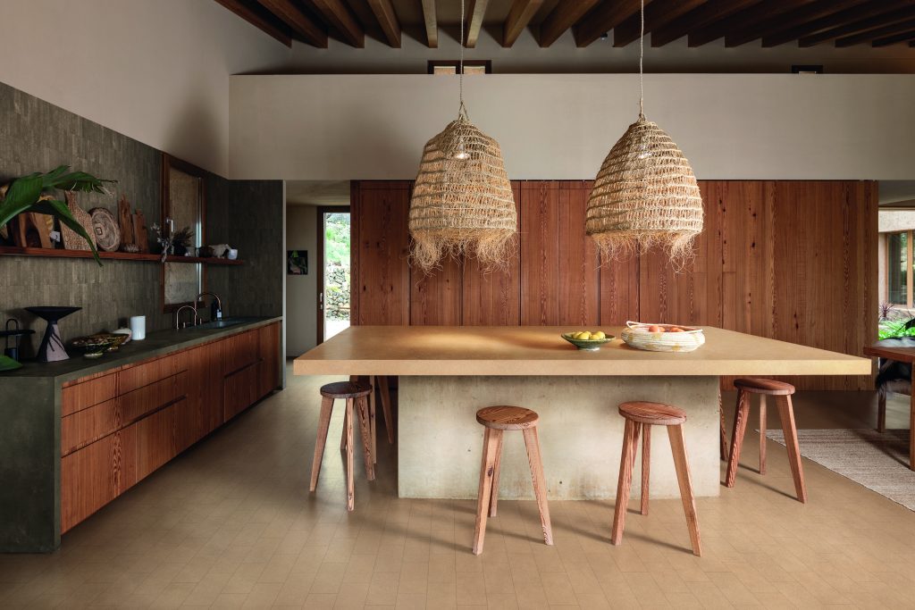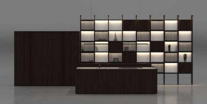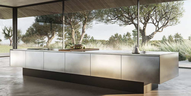 L’idea è quella di un ritorno, immaginario, alla natura. E la cucina Natura, ispirata alla luce, all’aria e ai materiali primari, punta a favorire il benessere e l’equilibrio, individuale e collettivo. Le superfici privilegiano le essenze lignee a venatura verticale, i top in grès richiamano marmo e pietra, mentre ogni elemento tecnico viene nascosto: dalle prese incassate in alluminio alle ante che non hanno maniglie, fino ai pannelli scorrevoli in legno massello. Proprio questi ultimi, con le loro sottili fessure verticali, trasformano la cucina in un ambiente living dove la luce filtra come tra gli alberi di un bosco. Il sistema verticale a ripiani, alternando pieni e vuoti, sostituisce i pensili tradizionali e completa uno spazio in cui la cucina si fonde con il soggiorno.