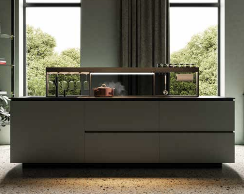Brooklyn è una cappa a scomparsa che reinventa l’isola cucina grazie a una struttura a ponte che libera spazio e integra funzioni avanzate. Il design pulito unisce alluminio satinato nero e vetro fumé, mentre la tecnologia si mimetizza. Il sistema è modulare, personalizzabile e multifunzione e include contenitori accessoriabili, comandi touch, controllo remoto e connettività con i piani cottura Falmec tramite Dialogue System. Nella struttura può essere integrato anche un modulo rubinetto per l’erogazione dell’acqua.
