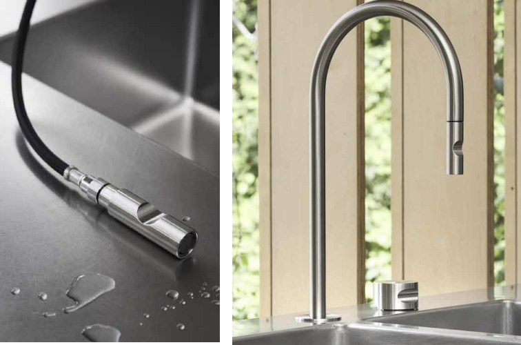 Thumb è un gruppo miscelatore da piano in acciaio inossidabile AISI 316L con bocca girevole e estraibile. Il suo tratto distintivo: una serie di volumi in acciaio puro da cui viene asportata una piccola porzione di materiale, ottenendo quel segno che diventa subito suggerimento d’uso. Questo gesto di sottrazione genera una geometria morbida che accoglie le dita. Il carattere innovativo del progetto è anche la fresatura realizzata sulla superficie frontale del rubinetto e della doccetta: un segno formale distintivo di tutta la collezione.