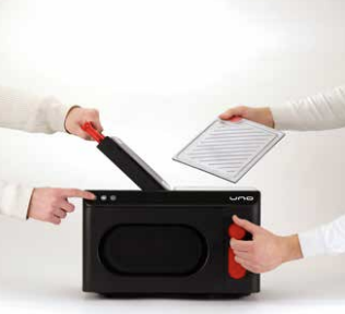 Uno è un elettrodomestico compatto che integra microonde e doppia piastra a induzione in un unico dispositivo. È pensato per ambienti con spazi ridotti e tempi stretti, come co-housing, co-working e affitti brevi. Le due piastre sono collegate da un sistema di cerniere che permette la rotazione di una sull’altra, ottimizzando così l’uso dello spazio. Una griglia in ghisa magnetica consente la cottura diretta, senza padelle, grazie all’induzione. Interfaccia intuitiva, componenti ergonomici e attenzione alla producibilità industriale guidano il design. Con materiali selezionati per durabilità e sicurezza alimentare, offre una risposta versatile alle nuove abitudini abitative e di consumo.