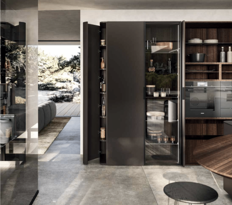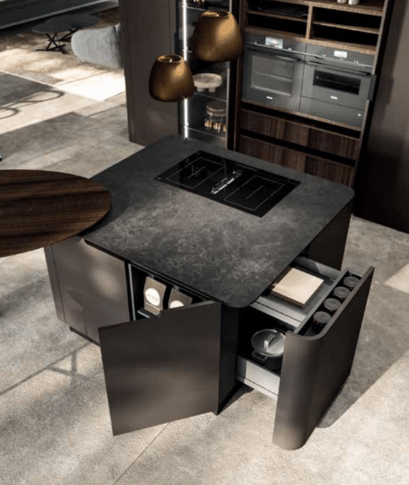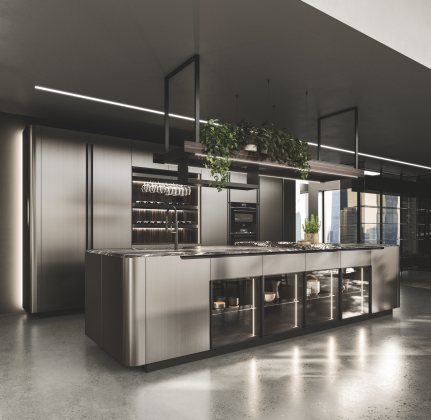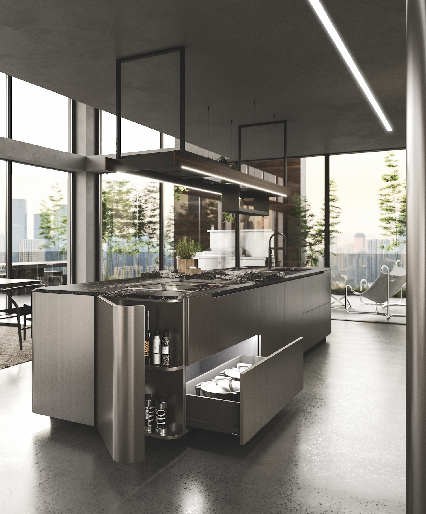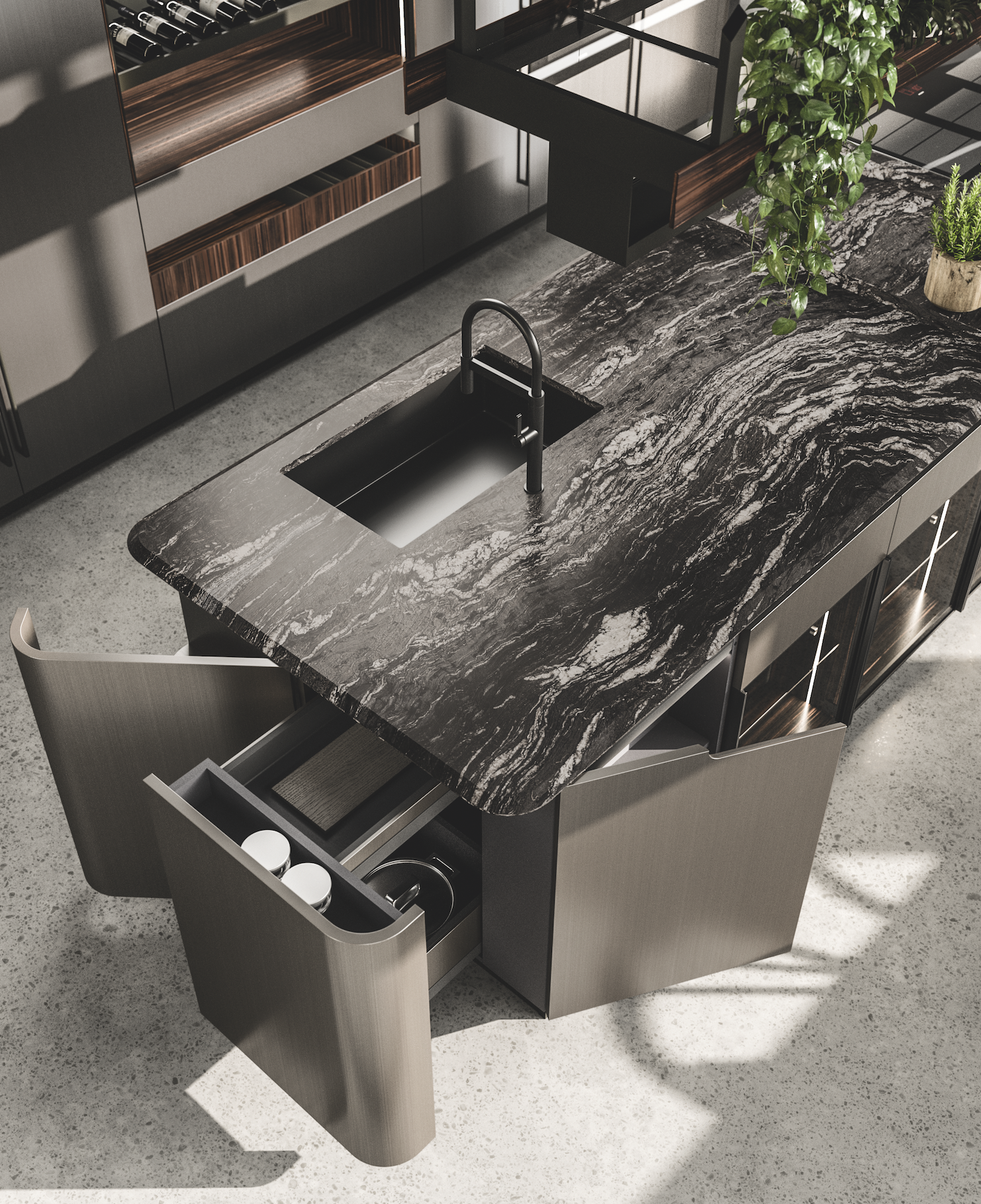 - La seconda proposta evidenzia invece il potenziale ergonomico e contenitivo del sistema: i cestoni curvi ad estrazione laterale sfruttano ogni angolo della composizione, garantendo massima capienza senza sacrificare la continuità formale. Ne risulta una cucina funzionale, raffinata e perfettamente integrata.