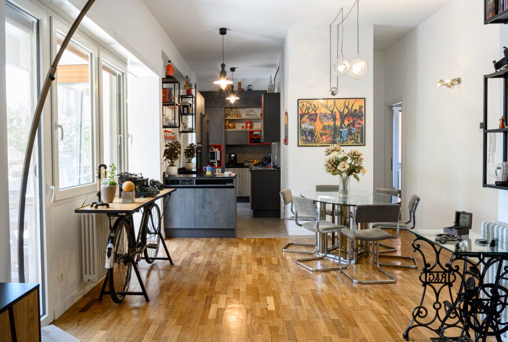 Nel duplex di Roma ristrutturato dallo studio Remodulare, la cucina dai colori autunnali finita con un mix di materiali si armonizza con la zona giorno antistante, arredata con pezzi vintage e industrial accostati ad elementi contemporanei