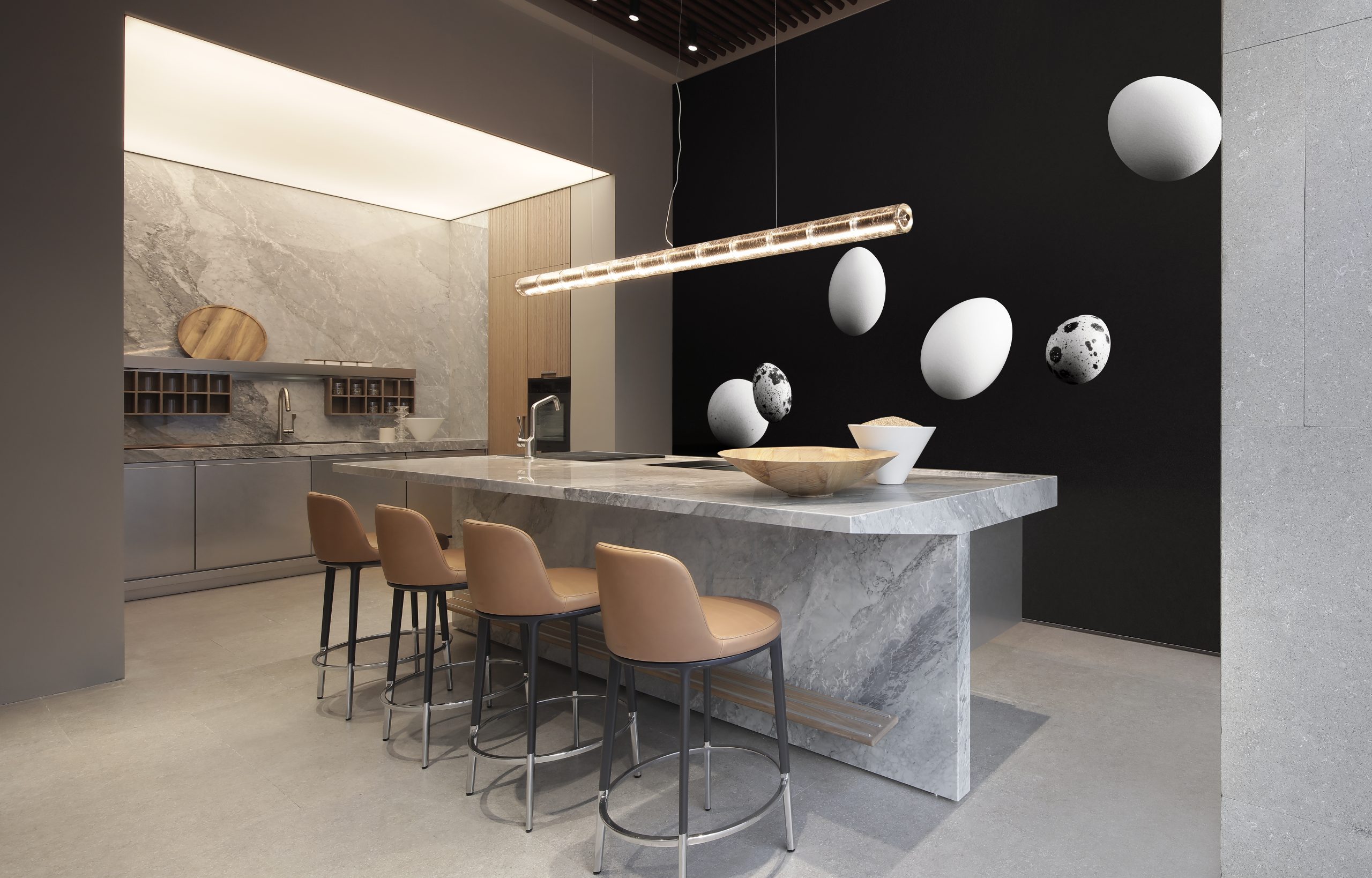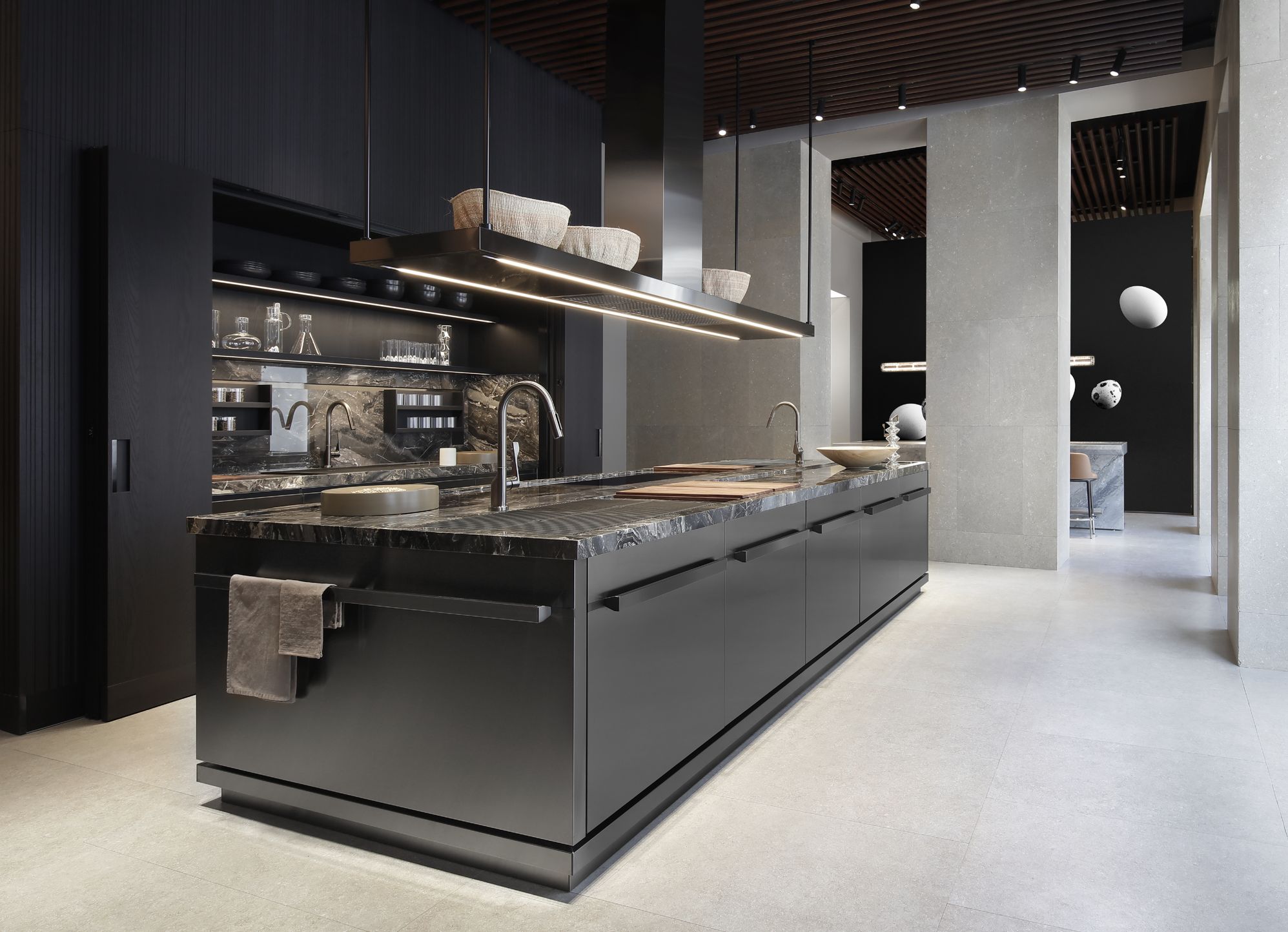 Nello showroom milanese del brand oltre a Prima e alla nuova versione di Proxima, in PVD nero, anche l’aggiornamento di Lignum et Lapis in una versione in marmo Versylis con cassettoni acciaio inox Vintage. Plus dell'ambientazione è la zona-armadio “wet” aperta, senza porte, nelle stesse finiture. "Lignum et Lapis rappresenta la show kitchen, ma quando uscì nel 2008 era ancora troppo moderna".