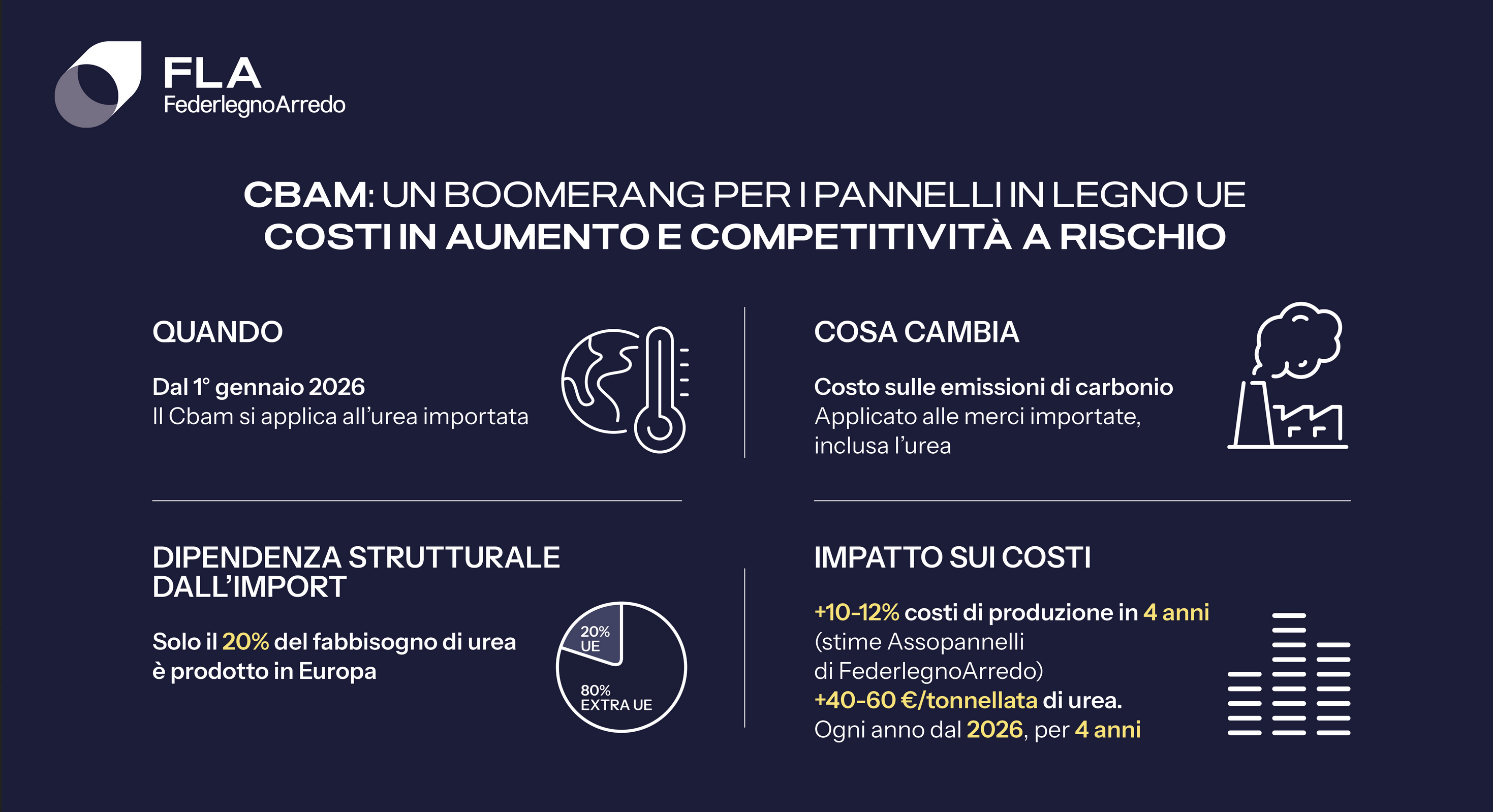 Una misura nata per difendere l’industria europea dalla concorrenza extra-UE rischia di produrre l’effetto opposto. È l’allarme lanciato da Assopannelli (l’associazione di FederlegnoArredo che riunisce i produttori di pannelli e semilavorati) e dalla European Panel Federation (EPF) sul Cbam (Carbon Border Adjustment Mechanism), il meccanismo europeo che dal 1° gennaio 2026 applicherà un costo alle emissioni di carbonio incorporate in alcune merci importate. Tra queste figura anche l’urea industriale, materia prima essenziale per la produzione di colle e resine impiegate nei pannelli in legno destinati all’edilizia e all’arredo. Secondo le associazioni, l’attuale impostazione della normativa rischia di penalizzare un settore strategico e virtuoso, con ripercussioni lungo l’intera filiera del mobile europeo.