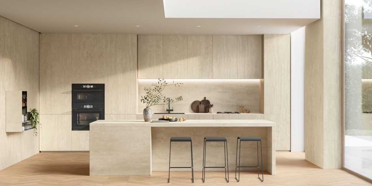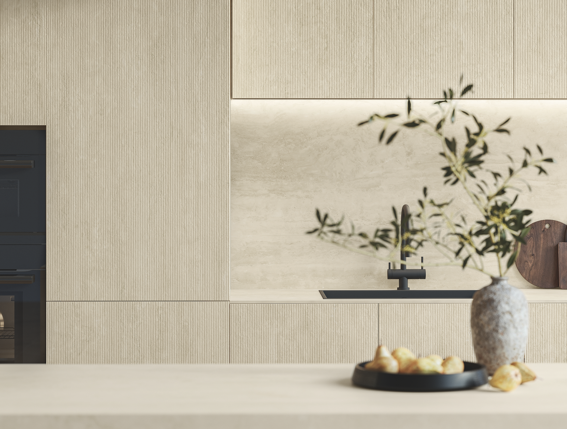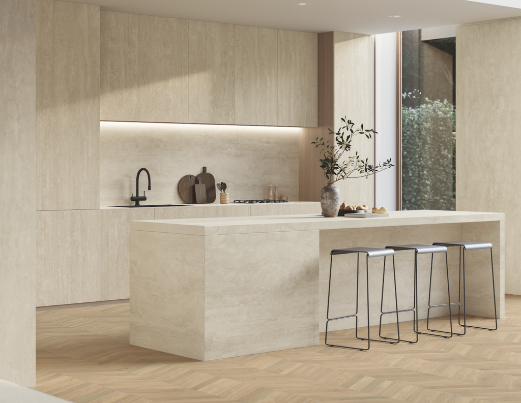 Travertino Navona White rappresenta una reinterpretazione attuale del travertino classico: una materia iconica della tradizione architettonica italiana che, attraverso il linguaggio delle grandi lastre Atlas Plan, si trasforma in una superficie emozionale, vibrante e perfettamente calibrata per l’ambiente cucina.