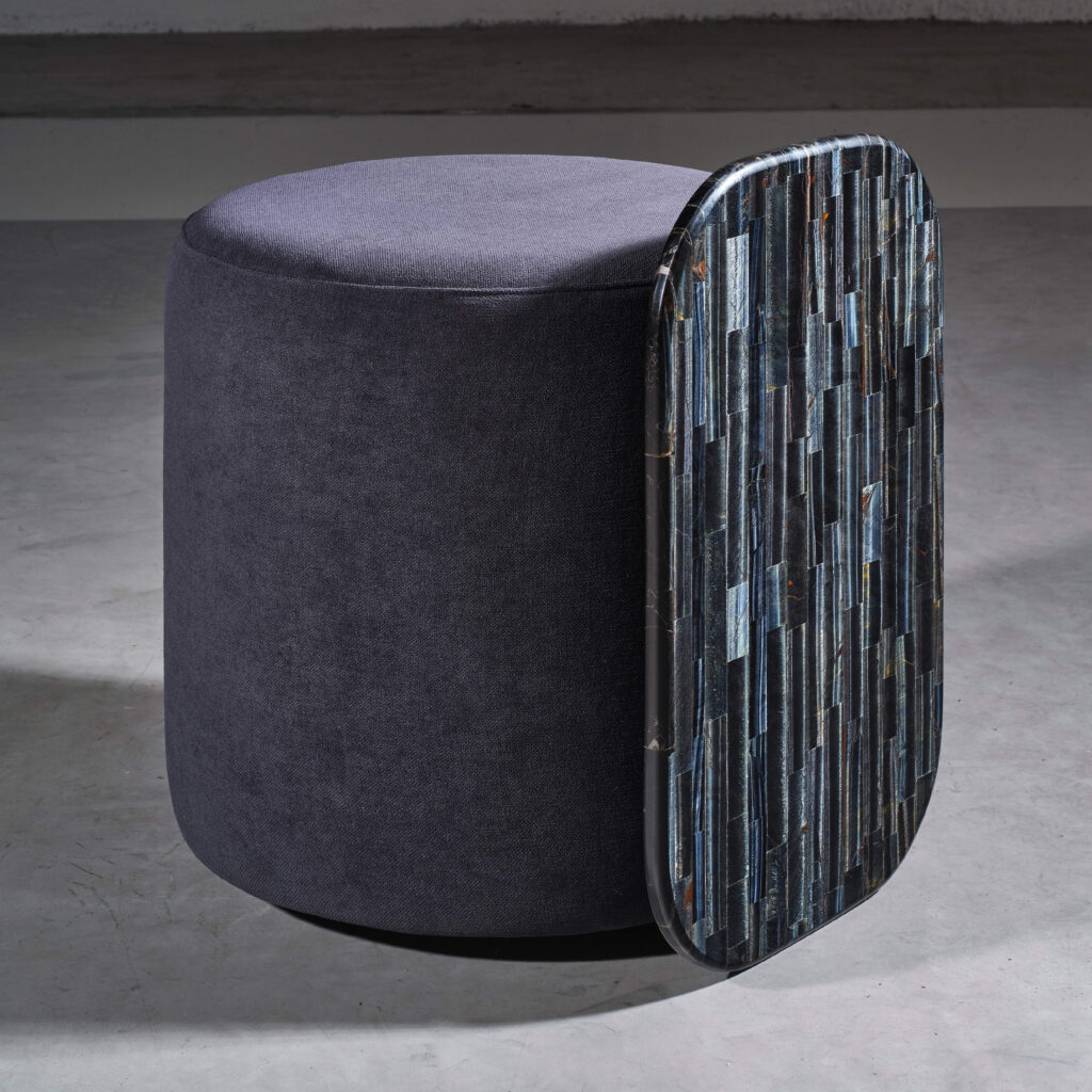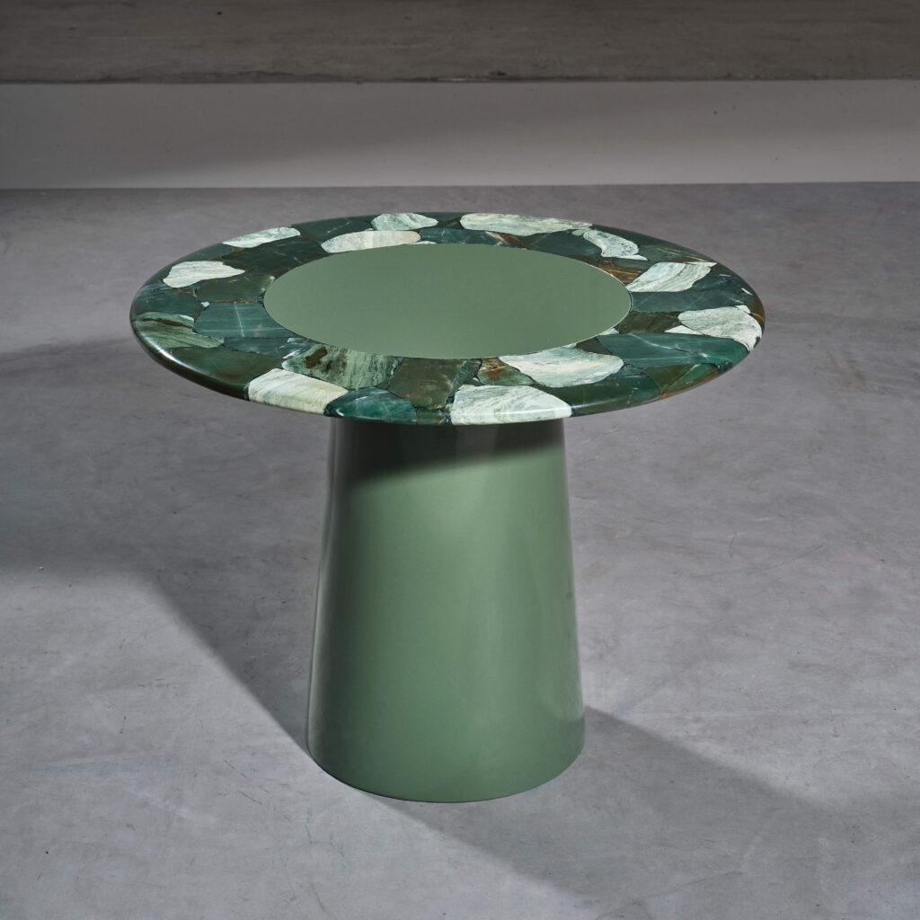 Questo approccio si riflette nel ruolo che Nemesi assume nel processo creativo. L’azienda si propone infatti come partner per architetti e designer, accompagnandoli nella scelta della pietra più adatta e nello sviluppo del progetto. Un lavoro di ricerca continua, che mira a superare i confini tradizionali dell’utilizzo dei semipreziosi, esplorandone nuove forme e linguaggi. “Personal Luxury”, ideato dall’art director Matteo Agati, traduce questa visione in uno spazio espositivo concepito come una sorta di percorso museale aperto. Il visitatore è invitato a muoversi tra i pezzi della prima collezione di arredi firmata dallo stesso Agati, dove tavoli e complementi nascono dall’incontro tra la forza visiva delle pietre e la solidità del metallo verniciato.
