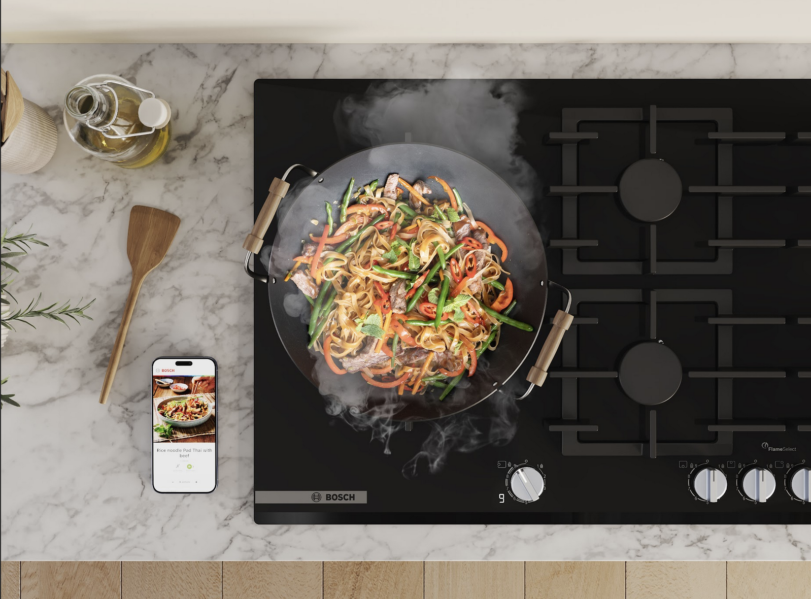 I nuovi piani cottura con tecnologia FlameSelect sono infatti predisposti per connettersi e lavorare in sinergia con le cappe di aspirazione Bosch. È possibile sincronizzarli tramite l’app Home Connect e gestirli entrambi dal pannello di controllo del piano cottura. L’app consente di verificare facilmente se il piano cottura è acceso o spento in qualsiasi momento. Non solo: la funzione Smart Hood Automatic regola anche in automatico la potenza di aspirazione della cappa in base alle impostazioni del piano cottura e alla potenza della fiamma.
