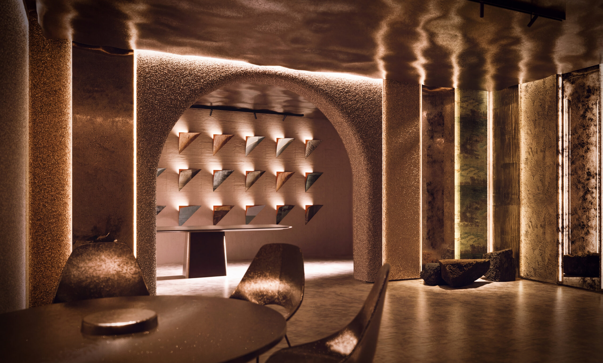 All’interno dello spazio sono presenti sei sedute Medea — la Medea Chair — reinterpretate da Uy con una finitura in Metallo_Fuso. La struttura rimane invariata, ma la superficie ne trasforma la percezione, mostrando come un trattamento materico possa modificare il carattere di un oggetto. “Nel progetto abbiamo volutamente spostato l’attenzione dal colore alla materia", afferma l'architetto Michael Vincent Uy. Lo showroom diventa uno spazio dove esplorare la dimensione tattile e luminosa delle superfici: pareti, arredi e volumi funzionano come campi materici che reagiscono alla luce e costruiscono l’atmosfera dell’ambiente.” In questo modo, come sulle pareti così sull’arredo, il rivestimento diventa lo strumento attraverso cui lo spazio prende forma e si rivela allo sguardo del visitatore. “La signature collection diventa in quest’ottica uno strumento per stimolare i sensi, suscitare emozioni e ispirare architetti e designer alla ricerca di soluzioni originali, sofisticate e memorabili”, afferma Roberta Vecci, International Marketing Director San Marco Group.