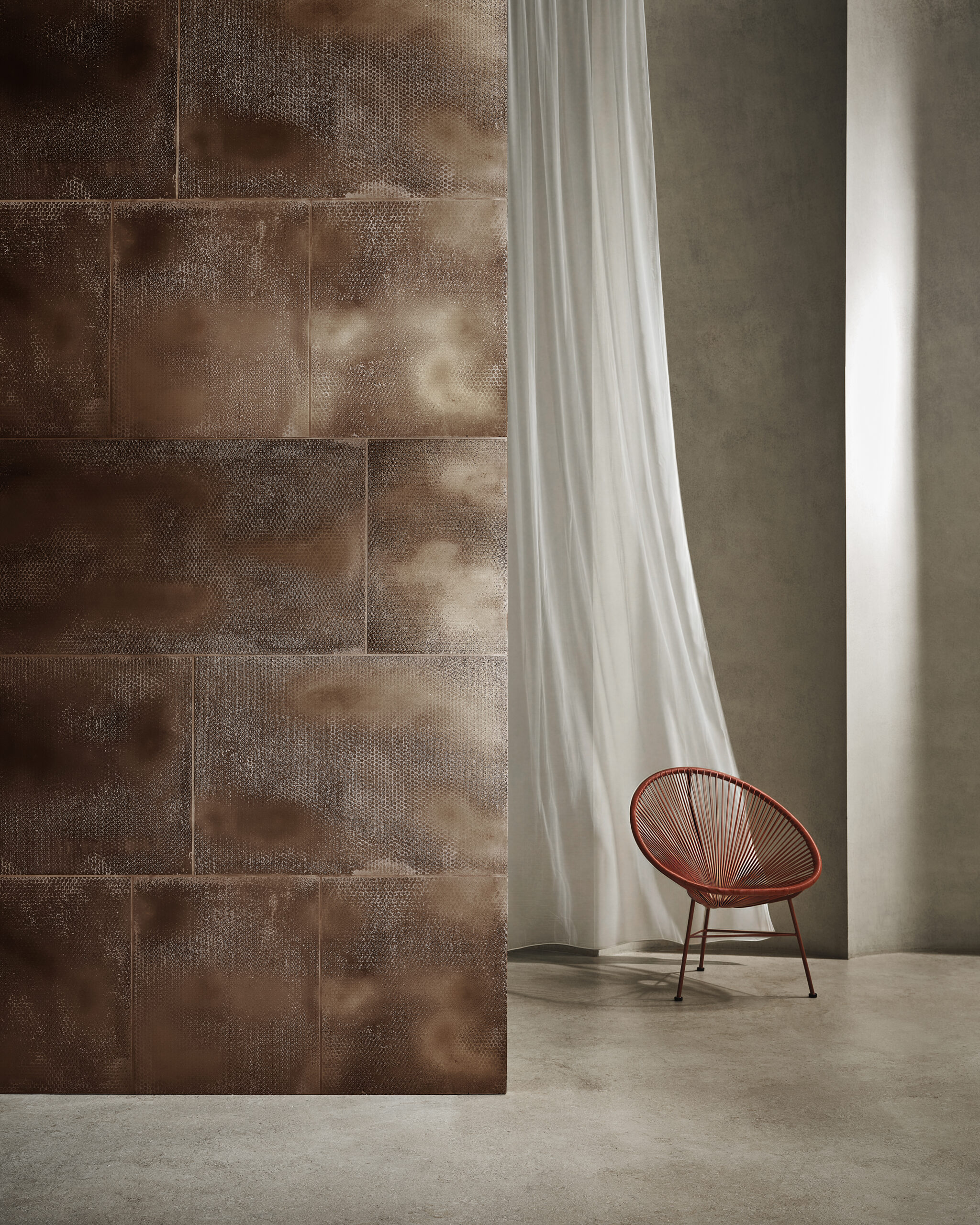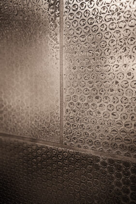 - HIVE – Trama di rilievi puntiformi che dialoga con la luce, trasformando la texture in dettagli luminosi e profondità percepibile - I prodotti sono: Zeus (argento), Metallo_Fuso (rame), NovaPrimer.