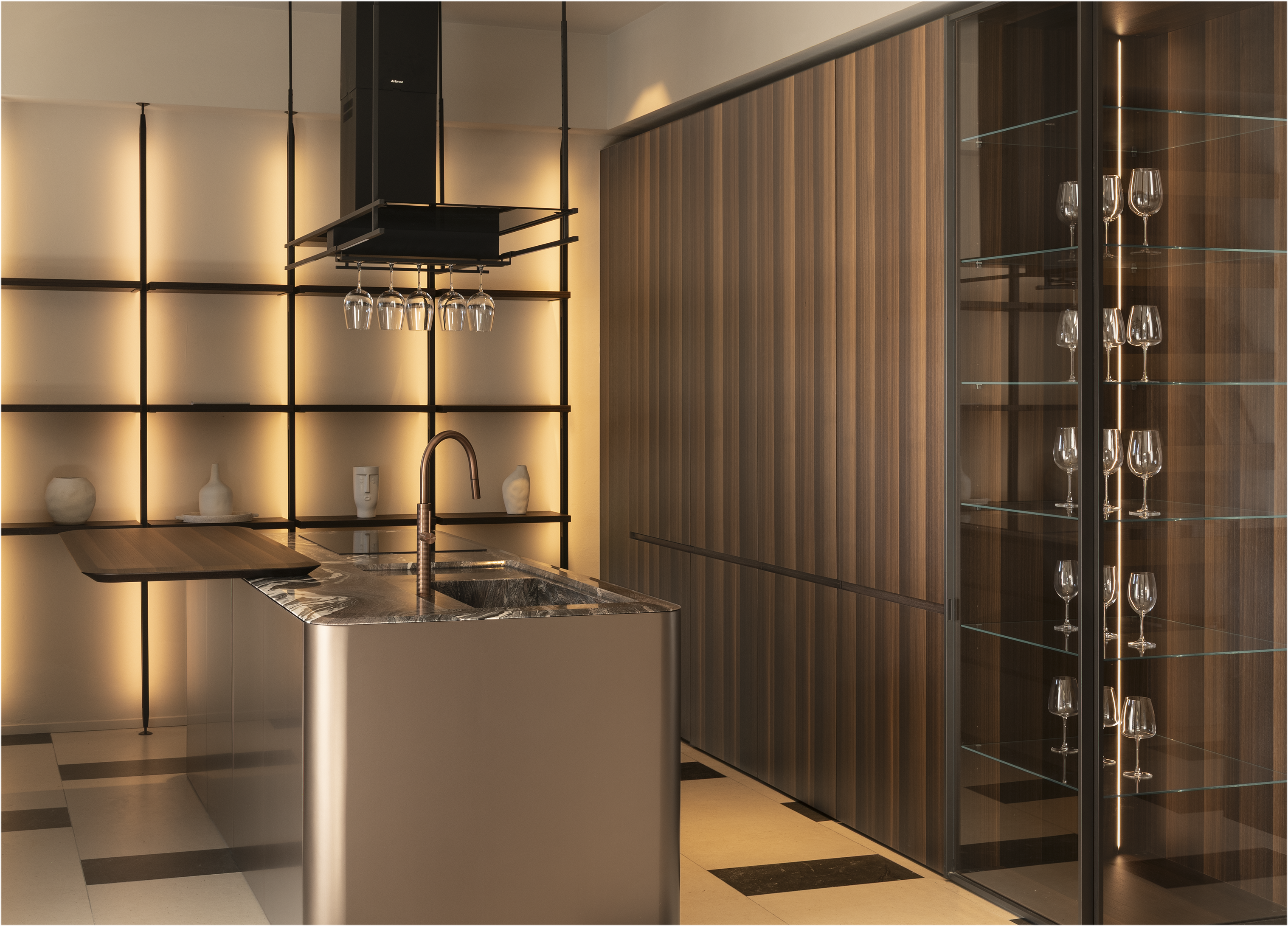 Un incontro armonioso tra superfici, dunque, che si accostano alle linee organiche delle fiancate curve dell’isola plasmando volumi e proporzioni e dando vita a un insieme equilibrato e raffinato. Di forte resa estetica è il marmo Cipollino Rosso del top, che si interseca con il laccato Metallo Liquido Rame Argento satinato anticato delle ante creando un dialogo di forte intensità materica. Altro dettaglio di spicco dell'isola, il top che asseconda la linea curva dell’angolo arrotondato.