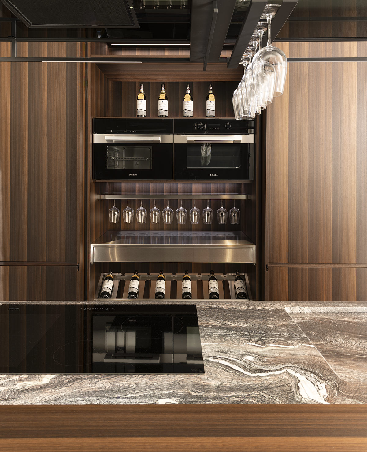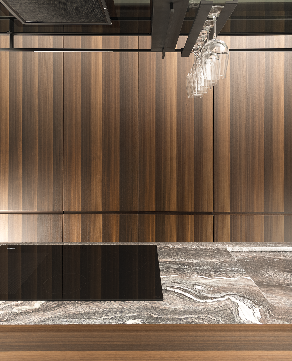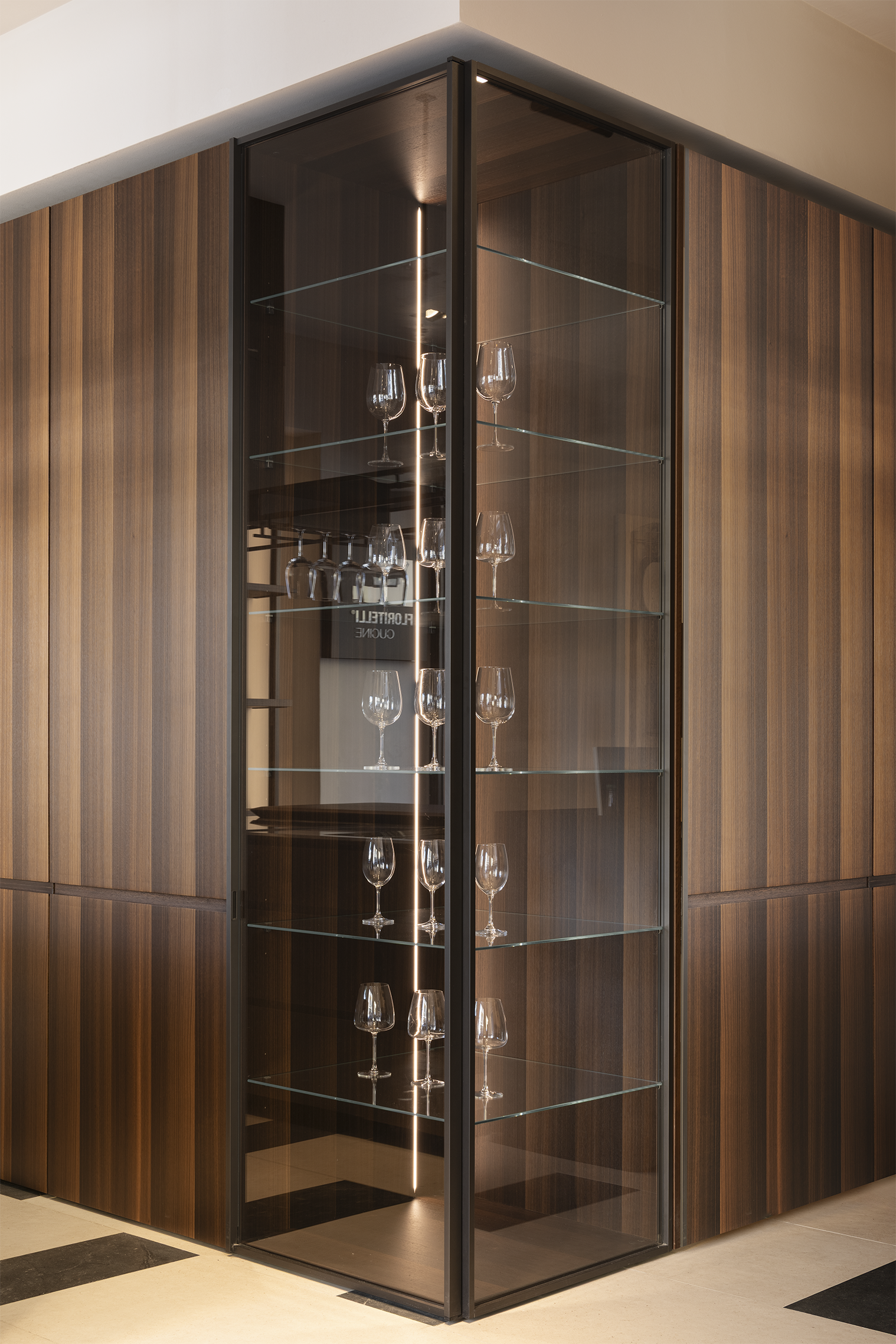 Peculiarità di C_34 si ritrovano anche nel design dell'armadiatura con ante in Eucalipto Termocotto, arricchita dalla colonna attrezzata con zona lavoro e dalla vetrinetta angolare con ante in vetro fumè trasparente e telaio in alluminio anodizzato nero, finita internamente con ripiani in vetro e illuminazione a led integrata. La libreria Stilo con struttura in alluminio verniciato e i complementi e accessori completano il progetto C_34 di Floritelli, che reinterpreta la cucina come spazio scultoreo e dinamico, definito da materiali preziosi e da tecnologie integrate invisibili.