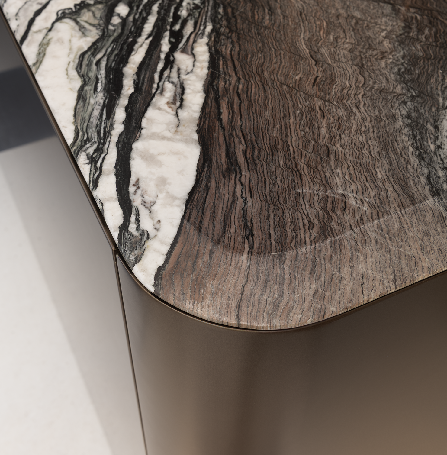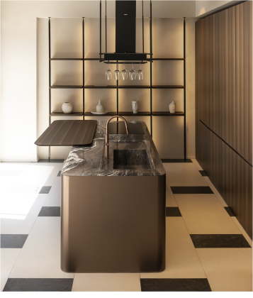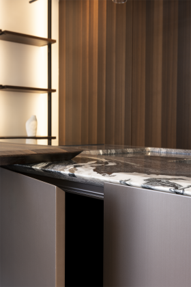 Un incontro armonioso tra superfici, dunque, che si accostano alle linee organiche delle fiancate curve dell’isola plasmando volumi e proporzioni e dando vita a un insieme equilibrato e raffinato. Di forte resa estetica è il marmo Cipollino Rosso del top, che si interseca con il laccato Metallo Liquido Rame Argento satinato anticato delle ante creando un dialogo di forte intensità materica. Altro dettaglio di spicco dell'isola, il top che asseconda la linea curva dell’angolo arrotondato.