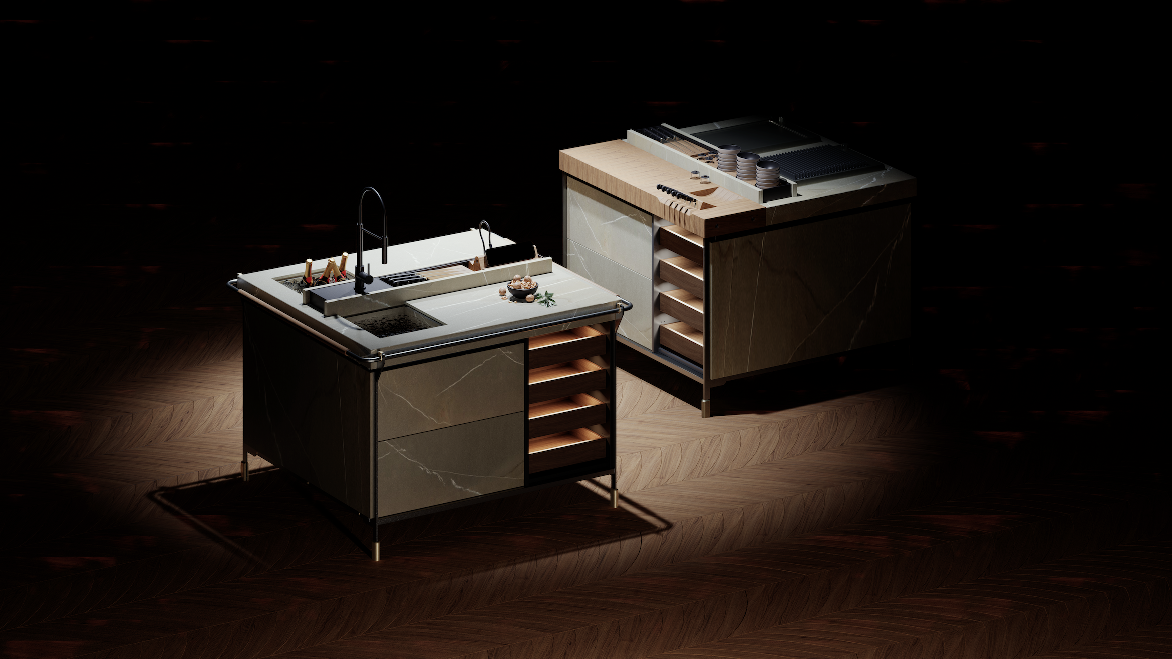 Disegnata dallo studio Ballabeni&Catellani, Canossa Outdoor non è una semplice cucina da giardino, ma un sistema modulare che fa del rigore compositivo la sua cifra stilistica. La purezza delle forme dialoga con una ricerca materica estrema, dove il metallo non è solo struttura, ma diventa protagonista estetico. Il cuore tecnico del progetto risiede in cinque pezzi inediti in fusione con finitura ottone, progettati in esclusiva per questo modello. Questi elementi, uniti a componenti in metallo pieno, permettono l'assemblaggio e la regolazione della struttura totalmente autonomi, garantendo una solidità strutturale che viene poi "vestita" da moduli in legno per un’estetica calda e sartoriale.