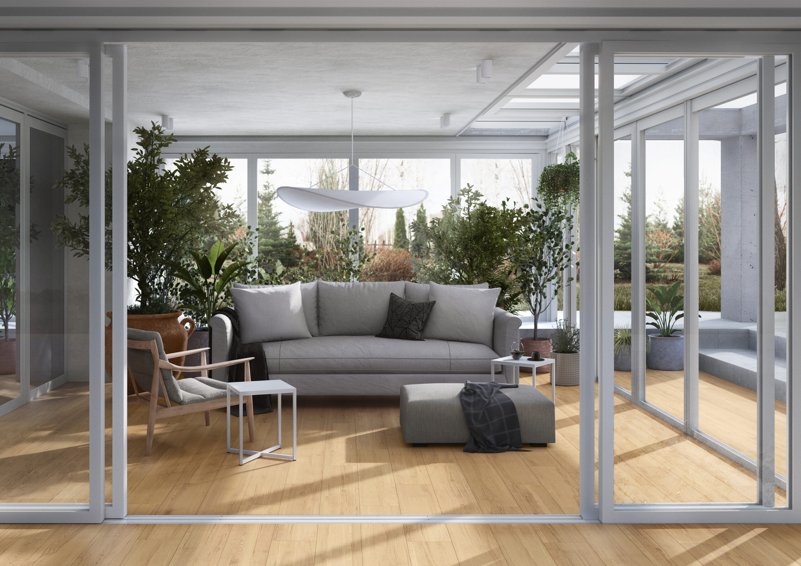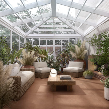 Per gli spazi esterni, il brand si avvale di una tavolozza di colori nelle nuance della terra per offrire pavimentazioni concepite come naturale estensione dell'abitazione verso l’esterno: le superfici ceramiche per l’interno e quelle antiscivolo per l’esterno permettono infatti la progettazione in perfetta continuità cromatica e materica. Giardini d’inverno, terrazze coperte e serre solari in gres porcellanato diventano così preziosi spazi aggiuntivi della casa che permettono, anche nella stagione più fredda, di godere del panorama esterno rimanendo al riparo in un luogo luminoso e accogliente.