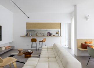 Nel progetto di ristrutturazione di un appartamento degli anni '60, firmato da Euga Design, l'open space della zona giorno include una mini cucina schermata da una quinta scenografica in legno, che integra con eleganza un bancone concepito anche come angolo bar