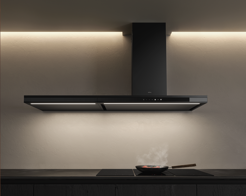 La linea Connex di Elica permette a cappe e piano cottura di dialogare tra loro grazie alla connessione via Bluetooth e al wi-fi integrato alle cappe, che consente la gestione da remoto tramite assistente vocale e app Elica. È possibile accendere, spegnere, regolare la potenza aspirante o l’intensità e il tono della luce della cappa con un semplice comando vocale o con un tocco sullo smartphone, per un controllo completo e una cucina sempre sotto controllo, anche a distanza. La cappa Element si distingue per il suo design essenziale che unisce eleganza e funzionalità, senza dimenticare il comfort. Super Plat è una vera e propria soluzione d’arredo che combina materiali inediti (vetro nero o grigio con elementi effetto ghisa) pensati per adattarsi facilmente a ogni stile di cucina.