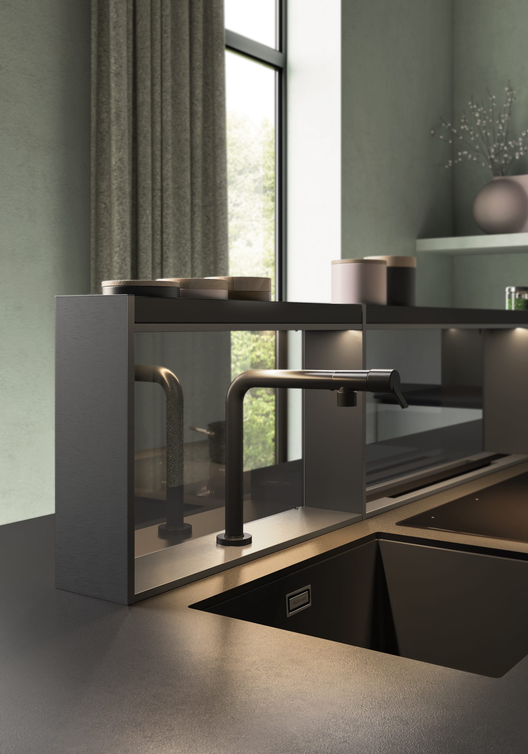 Nella nuova cappa Brooklyn di Falmec disegnata da Francesco Lucchese, ogni dettaglio e funzione si concentra in una struttura a ponte, progettata per ottimizzare lo spazio sull’isola e offrire libertà di personalizzazione. Il sistema si compone di un corpo cappa da 90 cm dotato di pannello apribile, accessoriabile con moduli laterali da 45, 60 o 90 cm e/o modulo da 60 cm con rubinetto. Previsti anche elementi aggiuntivi, come il portacalici e il portarotolo. Realizzata in alluminio satinato nero e vetro fumé, la cappa ha una strip LED con luce dinamica e dimmerabile. L’unità aspirante (classe energetica A+++) è equipaggiata con un motore brushless da 800 m3/h capace di garantire alte prestazioni con il massimo silenzio.