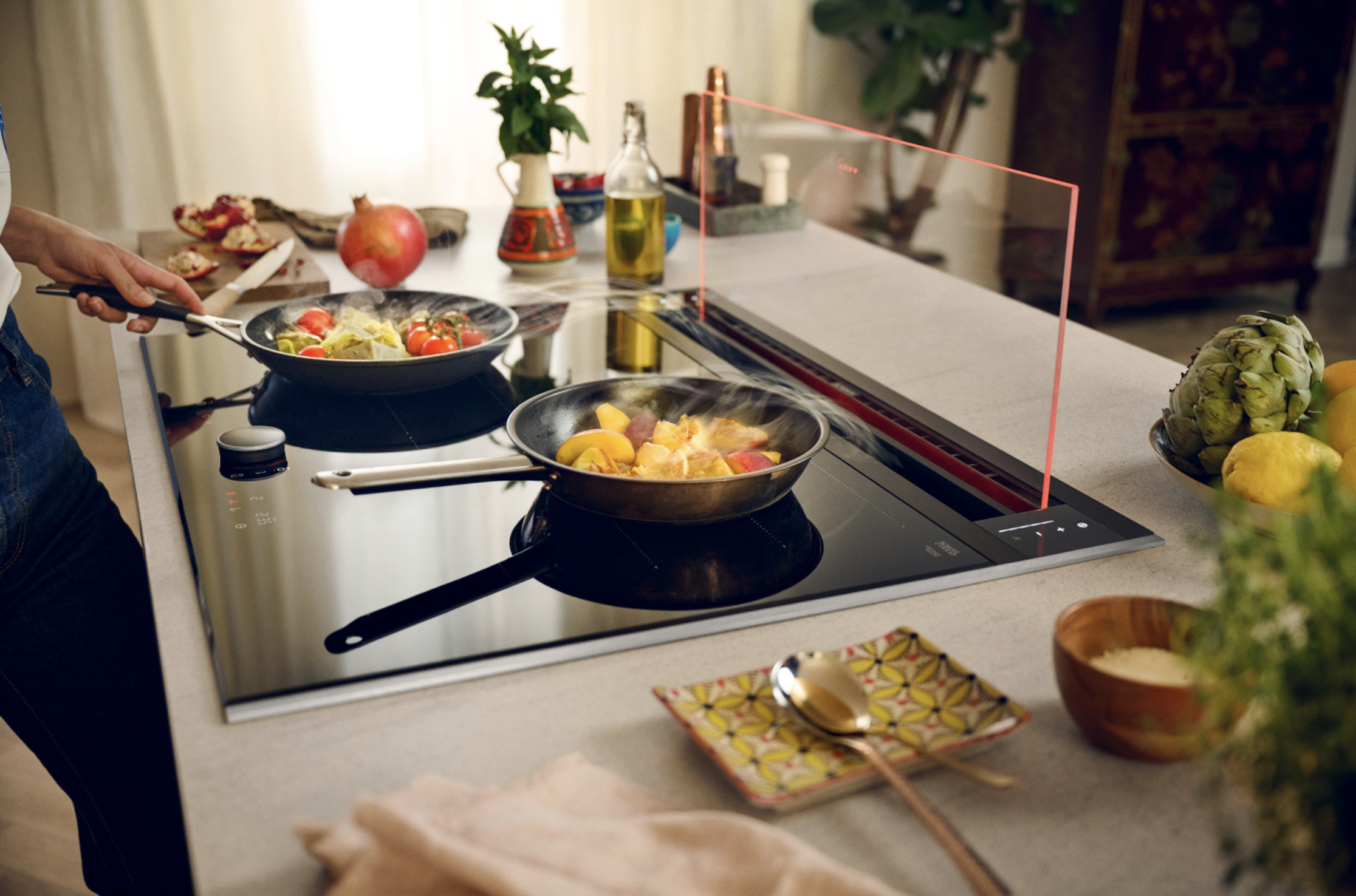 Rispetto alle normali cappe da piano, Glass Draft di Neff è caratterizzata da un pannello in vetro che elimina ogni tipo di barriera visiva perché emerge solo quando se ne ha bisogno. Inoltre, grazie alla tecnologia Guided Air si può dire definitivamente addio a fumi e odori, perché vengono aspirati da ogni angolo del piano cottura a prescindere da dove sono posizionate pentole o padelle sul piano cottura. Collegando la cappa all’App Home Connect, è possibile scegliere tra un’infinita gamma di colori per illuminare il profilo del pannello in vetro in modo da creare un'esperienza in cucina unica e ogni volta diversa, anche nelle feste. Disponibile nella dimensione 90cm e 80cm, può essere installata a filo oppure in appoggio sul piano di lavoro, in abbinamento al piano cottura a induzione di pari larghezza.