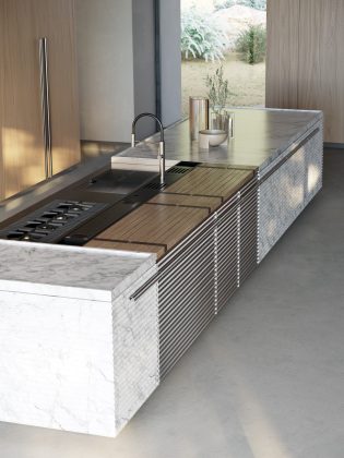 Tra le cucine più emblematiche della produzione di Schiffini, la cucina Cinqueterre può essere a pieno titolo considerata come un vero e proprio landmark della storia del design italiano, non solo della cucina. Sintesi equilibrata di innovazione e design, quando venne presentata nel 1999 segnò una vera e propria rivoluzione, irrompendo con la sua estetica industriale di alluminio in un mercato fino ad allora dominato dal laminato in tutte le sue forme e finiture. Lo scorso anno il brand ha presentato “Omaggio alla Cinqueterre di Vico Magistretti” introducendo una diversa dimensione materica: a fianco all’alluminio anodizzato, iconica finitura del modello, viene ora introdotta la pietra naturale, in particolare il Portoro, pregiata varietà di calcare nero proveniente dalla zona occidentale del Golfo della Spezia, quasi in tributo alle origini del brand.