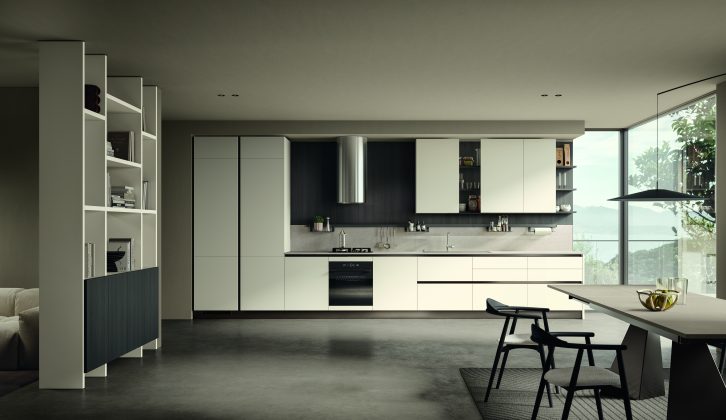 La collezione Alma di Arrredo3 è una composizione fresca e attuale con il richiamo alla tradizione dell’anta a telaio con presa integrata per una cucina ad angolo che termina con penisola e piano snack su supporto Tuttotondo. Il suo top è utilizzabile sia come piano di lavoro che tavolo, in questo caso servito da sgabelli Melodie del tutto rivestiti in similpelle e con poggiapiedi in metallo verniciato nero. Le ante bianche, eleganti e geometriche, sono fatte in un eco-friendly PET riciclato Suez, resistente e duraturo che con la sua finitura chiara e opaca contrasta con il resto creando una sensazione di luminosità e tranquillità.