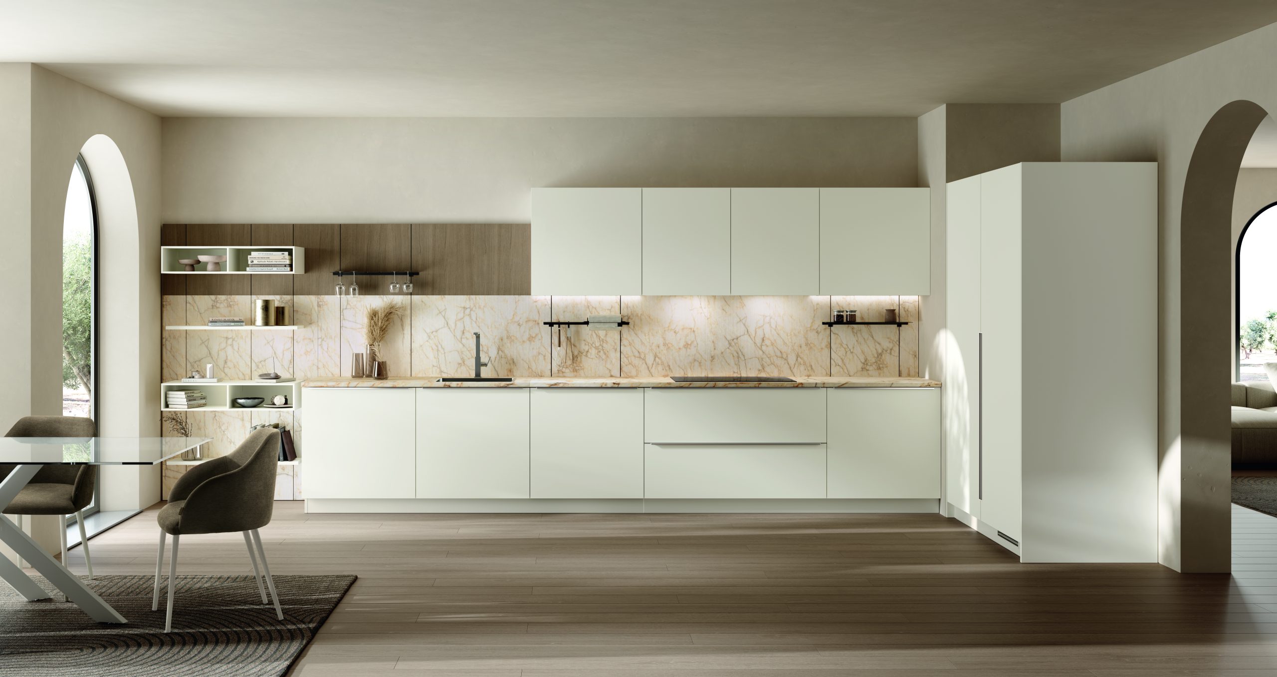 Nuove curve per Volare di Aran Cucine nel nuovo restyling disegnato da Ulisse Narcisi per la scorsa edizione di EuroCucina, contraddistinto dall’integrazione dei contenitori roto-traslanti. Questi elementi rappresentano un miglioramento dell'esperienza complessiva di utilizzo dello spazio poiché consentono una capacità di stoccaggio aggiuntiva fondamentale soprattutto se le dimensioni dell’ambiente domestico sono più contenute. Nella progettazione di una cucina, le ante vetro diventano strumenti fondamentali per la funzionalità e l’estetica dello spazio. La loro presenza riflette una crescente attenzione al dettaglio e un desiderio di coniugare eleganza e praticità in un’unica soluzione armoniosa.