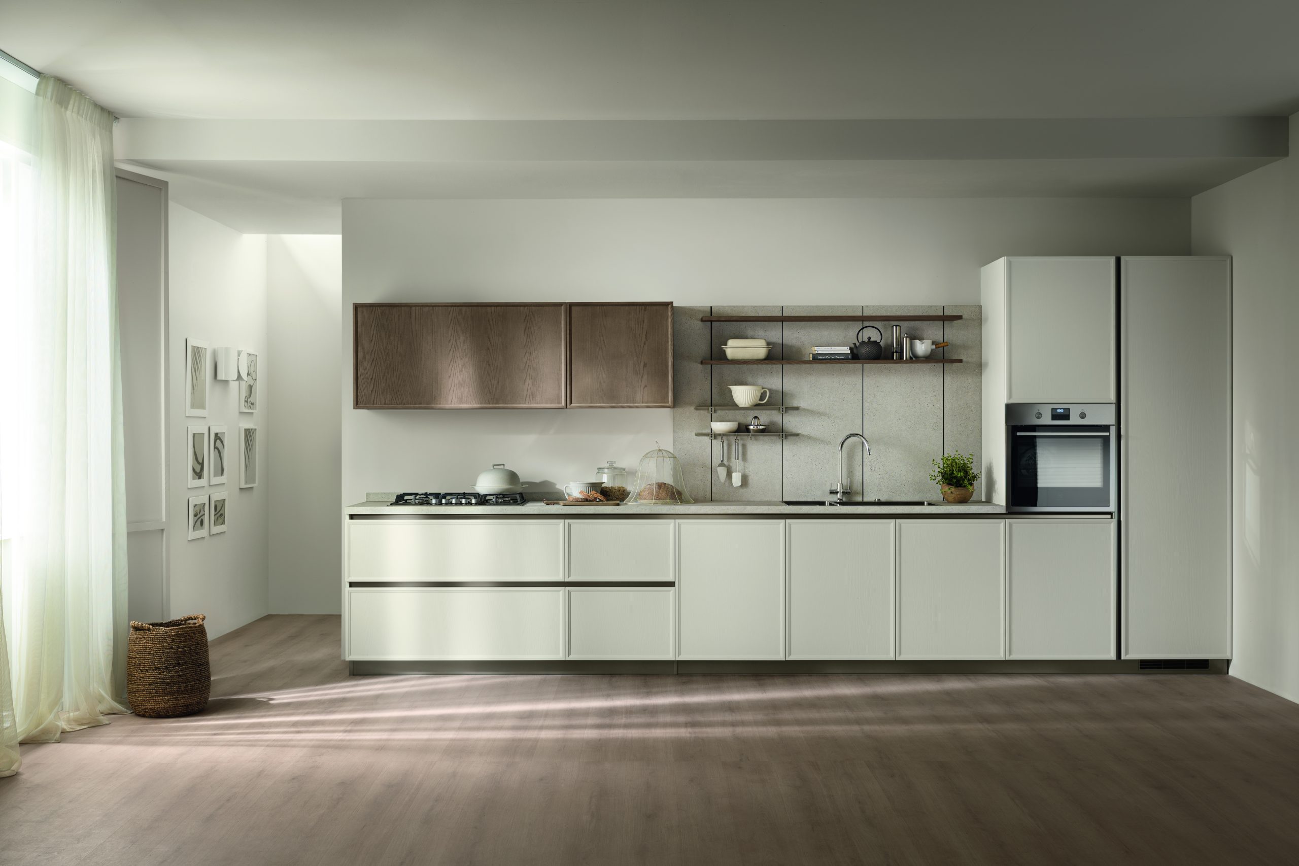 Numerose le interpretazioni dell’essenzialità rigorosa di Cloud Dancer in casa Scavolini. La cucina Essenza la propone in una composizione lineare con ante in decorativo Bianco Niveo e piano cucina in laminato Rio Bravo e barra Titan finitura grigio con accessori abbinati. Stessa finitura, decorativo Bianco Niveo, per le ante Sail dei pensili, mentre il sistema interparete "Fluida" presenta una struttura in decorativo Bianco Puro e ante in decorativo Quercia Brownie. Nella composizione lineare della cucina Mira (design Vuesse) le ante sono in decorativo Canapa, gli elementi a giorno in decorativo Gate Matter, il piano cucina in Laminato Burnt Wood. La cucina Poetica (design Vuesse) presenta basi e colonne dotate di ante telaio legno in Frassino Riso e pensili con ante legno in Frassino Pecan; gola e zoccolo in finitura Titanio; piano cucina in laminato Street Beige e Boiserie Vertical System in laminato Street Beige con mensole in Frassino Pecan.