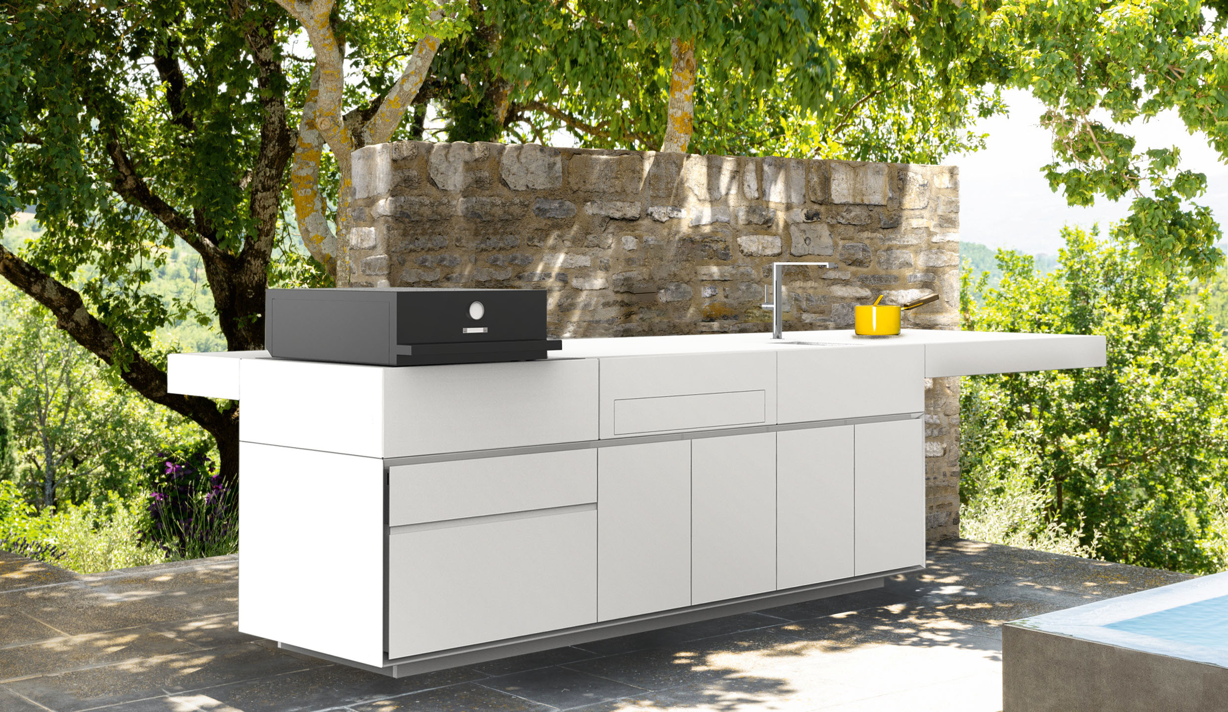 Tikal è la prima linea di cucine dedicate all’esterno del brand Talenti e ideata dall’architetto Nicola De Pellegrini dello Studio Anidride Design. E’ ispirata alle architetture mesoamericane, caratterizzata da un design severo e razionale. Realizzata in Zinco Magnesio, acciaio inox e alluminio, con verniciatura bianca ad alta resistenza agli agenti atmosferici e alle alte temperature. Il sistema si arricchisce di nuovi accessori, tra cui barbecue con forno e cassetti attrezzati, confermando la cucina come fulcro dello spazio outdoor e della convivialità.
