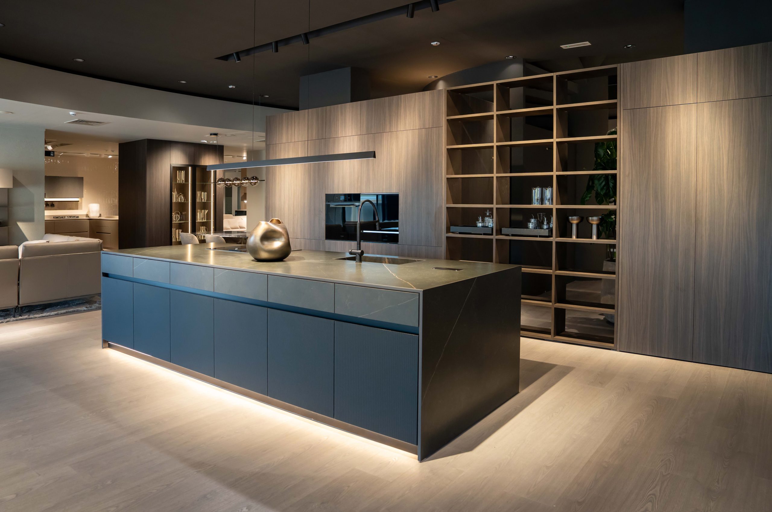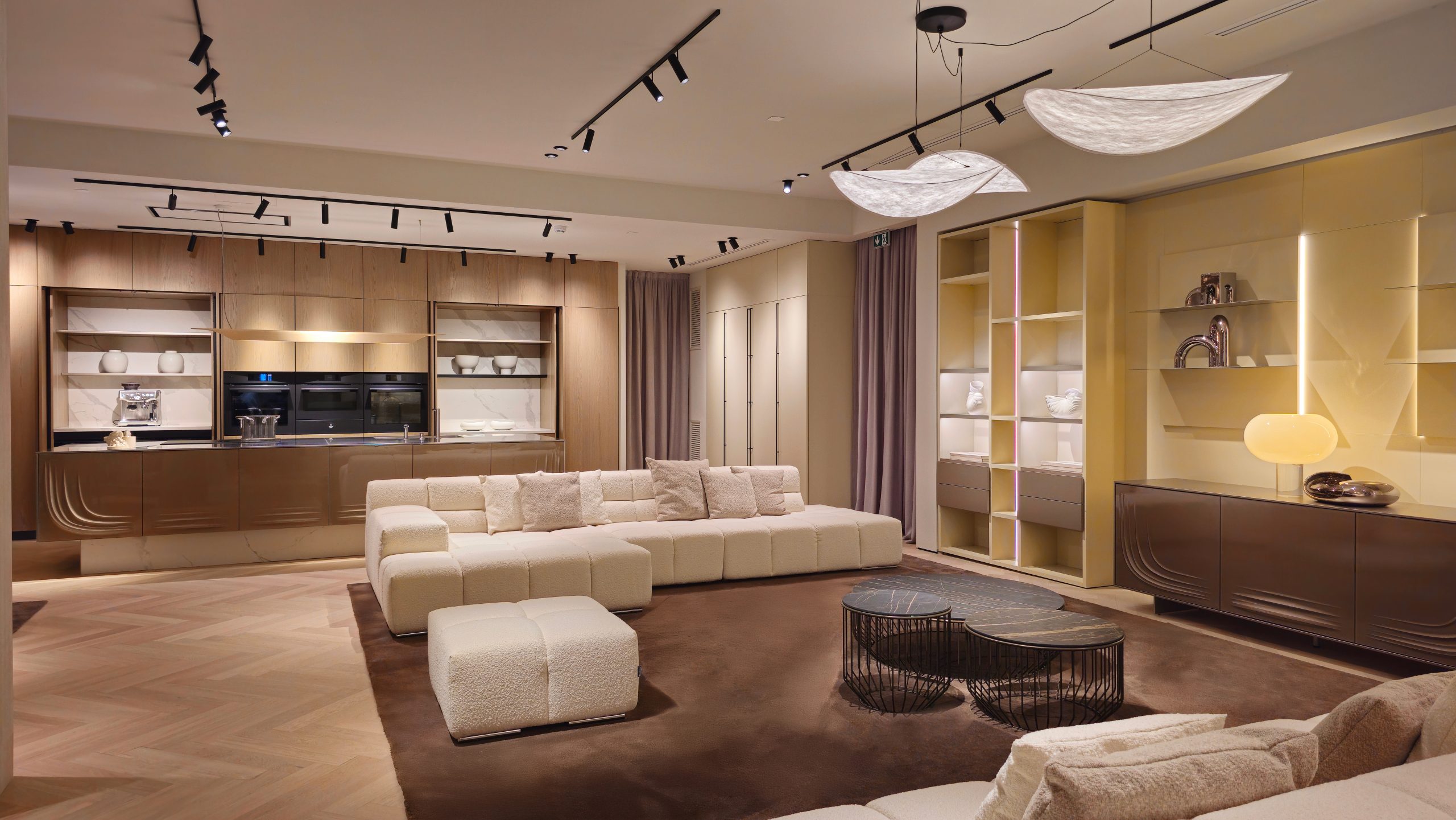 Qui la cucina Origina con anta Square Libeskind022, firmata da Daniel Libeskind, è il perfetto incontro tra rigore e creatività. Le tonalità neutre e le superfici in travertino e parquet posato a spina di pesce dialogano con la luce naturale, creando un ambiente cosmopolita e sofisticato. Casa Audace offreuna visione più audace e contemporanea, tra superfici materiche in ceramica, metalli satinati e divani modulari in velluto color petrolio. Casa A-Marem è lo spazio che ospita la collezione Onda, nata dalla collaborazione con Zaha Hadid Architects: un sistema cucina-scultura che gioca con geometrie fluide, riflessi champagne e texture ispirate agli elementi naturali.