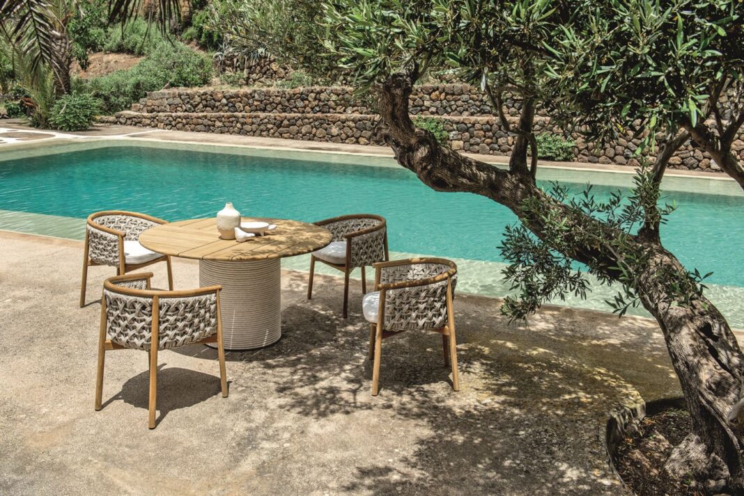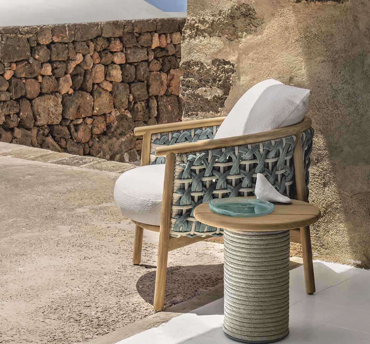 Materiali e intrecci preziosi e forme avvolgenti connotano la serie Patio, di Ethimo, creata in collaborazione con lo Studio Zanellato Bortotto. Per i tavoli dining e i coffee tables, sia rotondi sia ovali, è proposto un nuovo abbinamento: la base dal design scultoreo - realizzata in teak e avvolta da corda nautica - si unisce ora al calore del teak naturale del piano a doghe, posizionate con rigore geometrico. La poltroncina Club si connota invece per l'intreccio in corda azzurro laguna e light grey, ora disponibile anche in versione monocromatica, in corda light grey. Questa nuova opzione si estende a tutte le sedute lounge e dining.