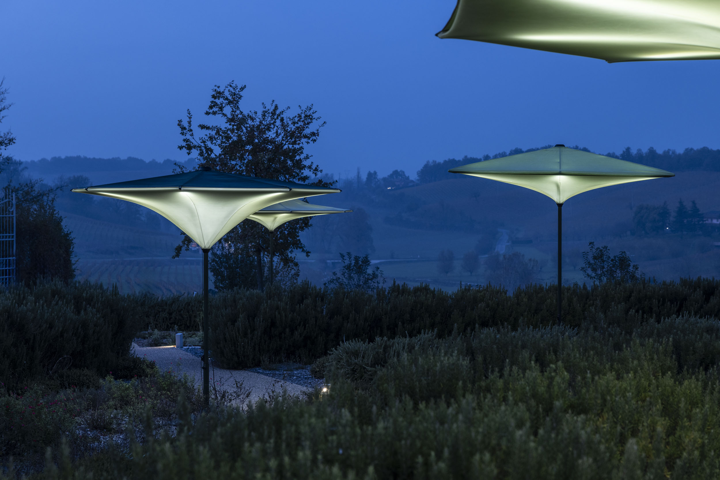 Disegnata dagli architetti fondatori dello studio Parisotto+Formenton, Feel Good di FIM - che sarà in mostra durante la Milano Design Week 2026 - è una famiglia composta da un ombrellone ed elementi accessori. Suggestivo soprattutto in modalità notturna, l'ombrello dalle forme essenziali e quasi archetipiche è declinato nelle geometrie quadrate e circolari. Dettaglio distintivo, le stecche che si prolungano oltre la tela. L'ombrellone Feel Good si completa con famiglia di elementi soft seating da design morbido ed organico delle forme a sasso, che si integrano alla base degli ombrelloni stessi.