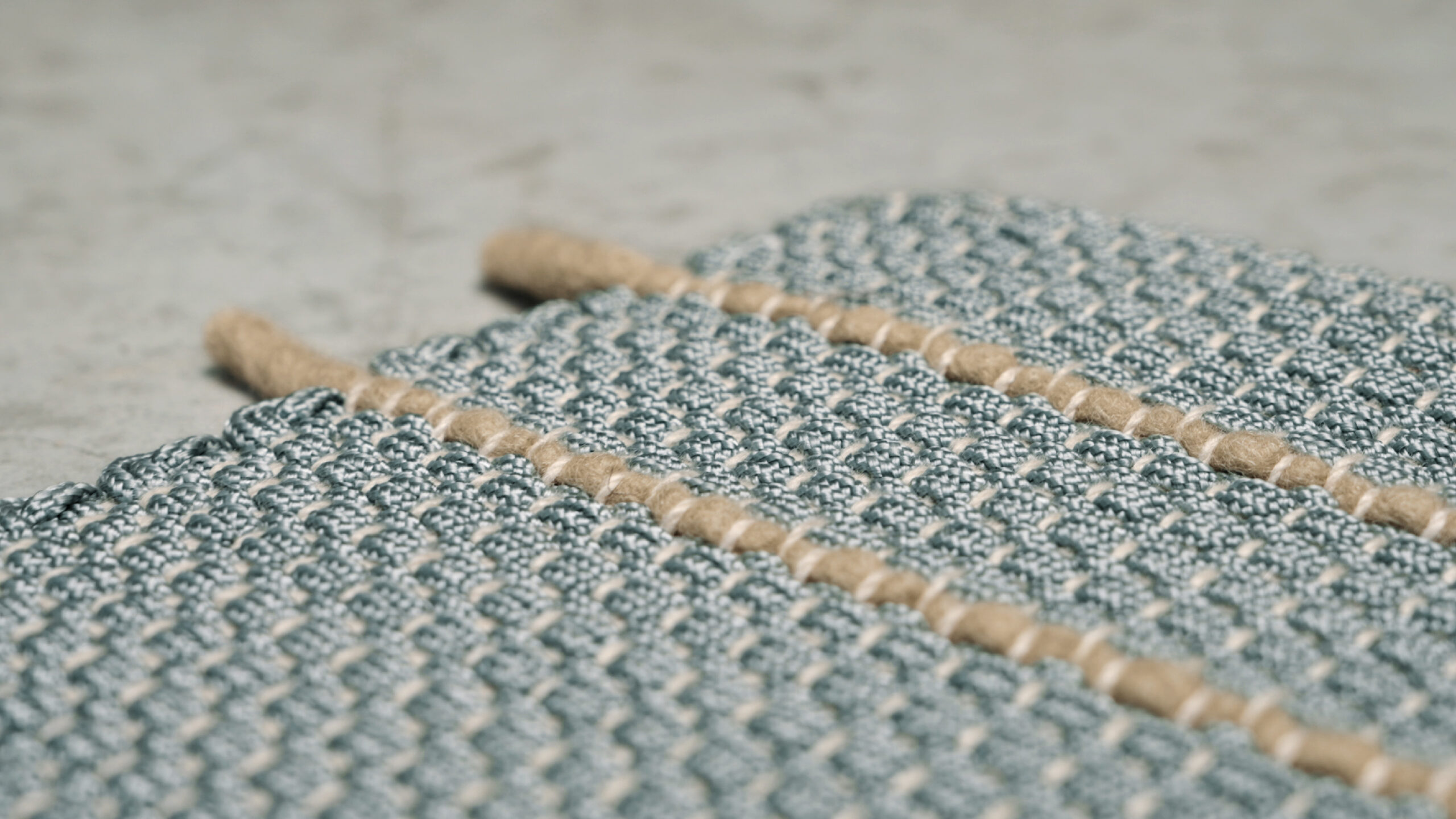 tessuto a mano nella nuova finitura Oceano, realizzato con un filato tecnico altamente performante e inserti cilindrici in feltro di lana che ne definiscono il ritmo e l’identità visiva. L. Resistente e versatile, è adatto sia a spazi interni sia ad aree esterne coperte, come patii, porticati e zone riparate del giardino.