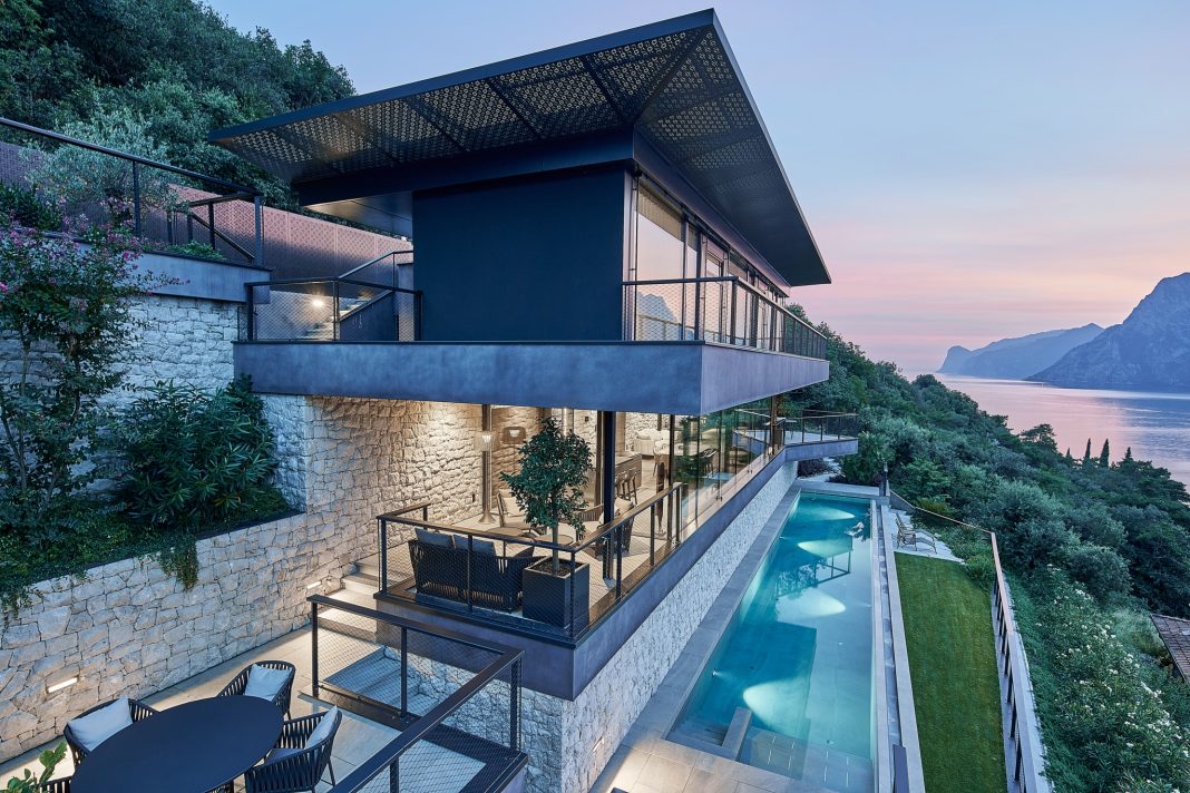 "Il punto di partenza di questo progetto è stato il contesto: un pendio calcareo che guarda verso il lago, in un paesaggio ricco di ulivi e vegetazione mediterranea", ci ha raccontato Daniel Oberrauc, responsabile progetto Rubner Haus della villa sul lago di Garda firmata dall'architetto Martin Thoma e realizzata da Rubner Haus secondo i principi della sostenibilit. "Non volevamo imporre un volume estraneo, ma creare un’architettura che si mimetizzasse diventando parte integrante del luogo. Per questo la villa è stata concepita come un organismo a terrazze, capace di adattarsi alla morfologia del terreno e di aprirsi con leggerezza verso il lago", spiega Daniel Oberrauc. Costruita su un declivio con vista panoramica, la villa si integra con grazia nel tutto seguendo i principi dell’architettura mimetica;ll’architetto Martin Thoma e Rubner Haus hanno infatti affrontato una vera sfida, realizzando un’opera armonica e sostenibile. L'edificio è infatti anche a basso impatto energetico: è alimentato da un impianto fotovoltaico integrato e da una pompa di calore aria-acqua, sistema che sfrutta l'energia termica dell'aria esterna come fonte per generare calore, il quale viene utilizzato per riscaldare l'acqua di radiatori o di altri terminali. Assecondando il pendio, con esposizione a sud-ovest, l’architettura combina legno, pietra calcarea locale, calcestruzzo a vista e vetro. In particolare, la pietra calcarea "che richiama la matericità della montagna e crea continuità con il contesto", dice Daniel Oberrauc, è impiegata sia per gli esterni sia per gli interni realizzando un'idea globale di continuità materica.