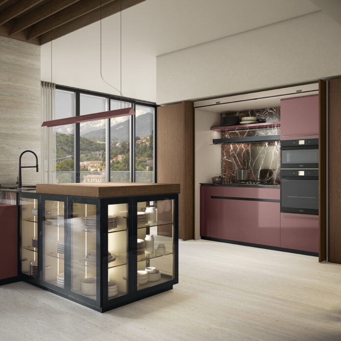 Una soluzione di Brera in cui le ante impiallacciate in Rovere Brandy si abbinano al laccato Granato Opaco e al top in grès Infinity Rosso Domus